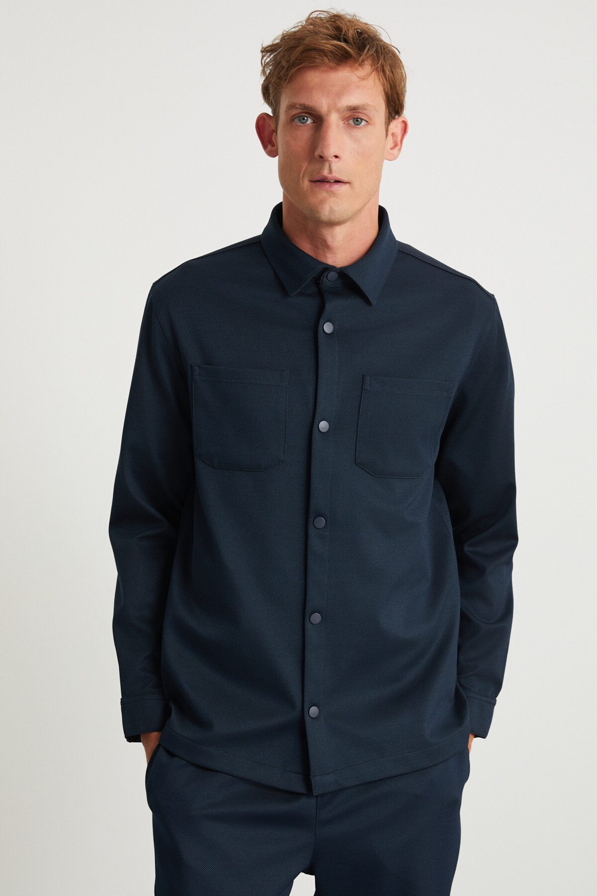 Gömlek yaka detayı ile klasik ve resmiyetten uzak, casual tarzını korur