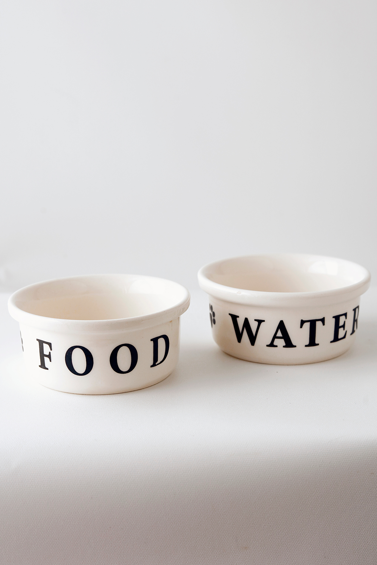 İçeriğinde iki adet food ve water yazan beyaz seramik mama ve su kabı mevcuttur.