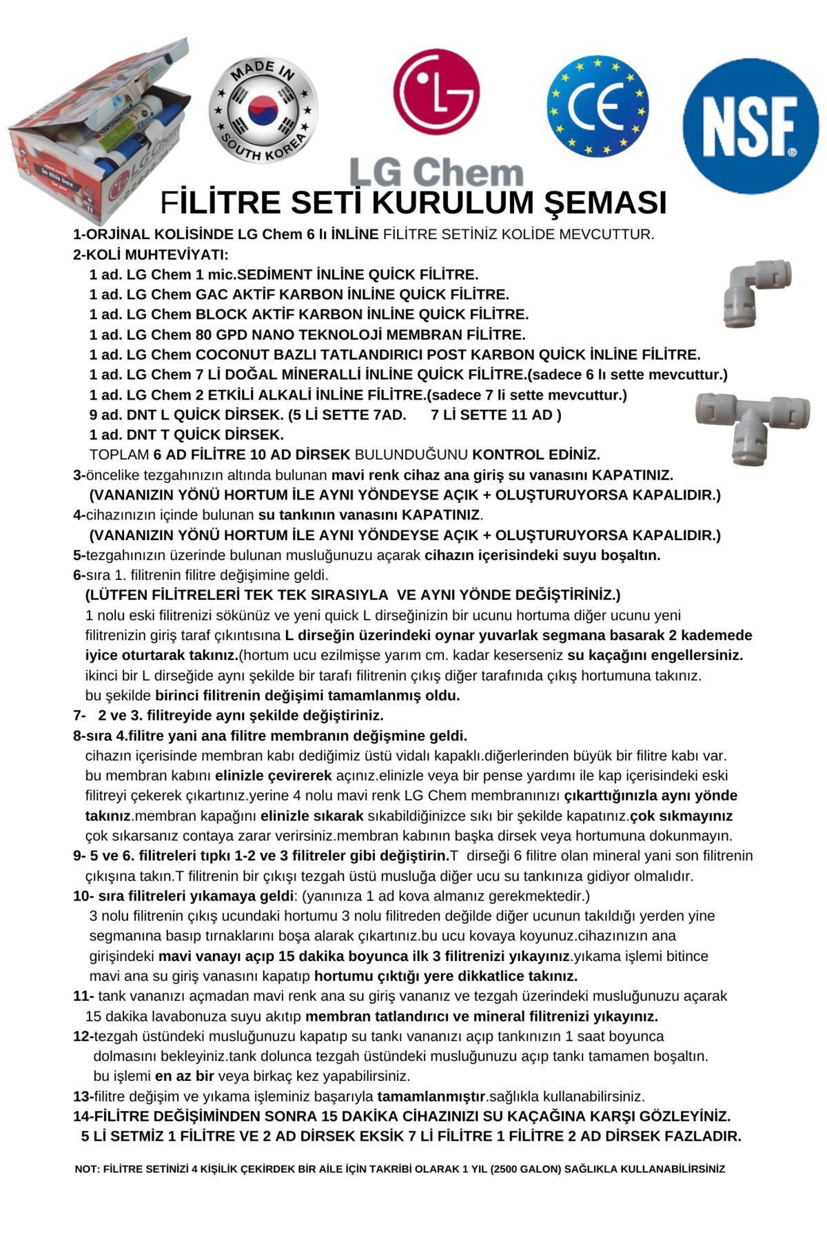LG Chem SU ARITMA CİHAZI ÜRÜN BİLGİLERİ : LG Chem SU ARITMA CİHAZLARI musluğunuzdan gelen şebeke veya kuyu suyunu üstün LG Chem filitrasyon ve ters ozmoz membran teknolojisi ile kum ,kir ,pas ,tortu ,kireç ,bulanıklık ,kötü koku ve tat lardan ,klor ,sülfür ,cıva ,pestitit ,organik safsızlıklar ,mikroorganizmalar ,tarım ilaç artıkları vs.
