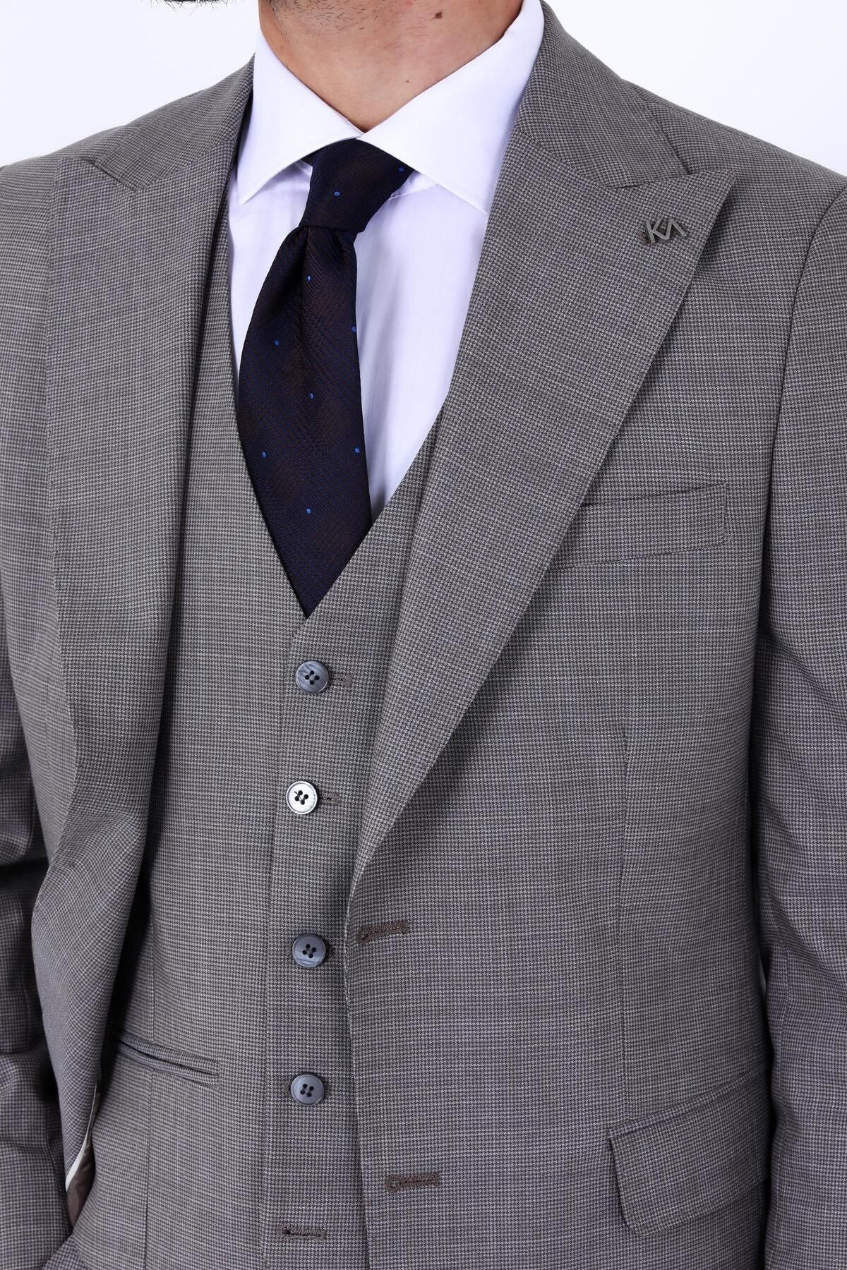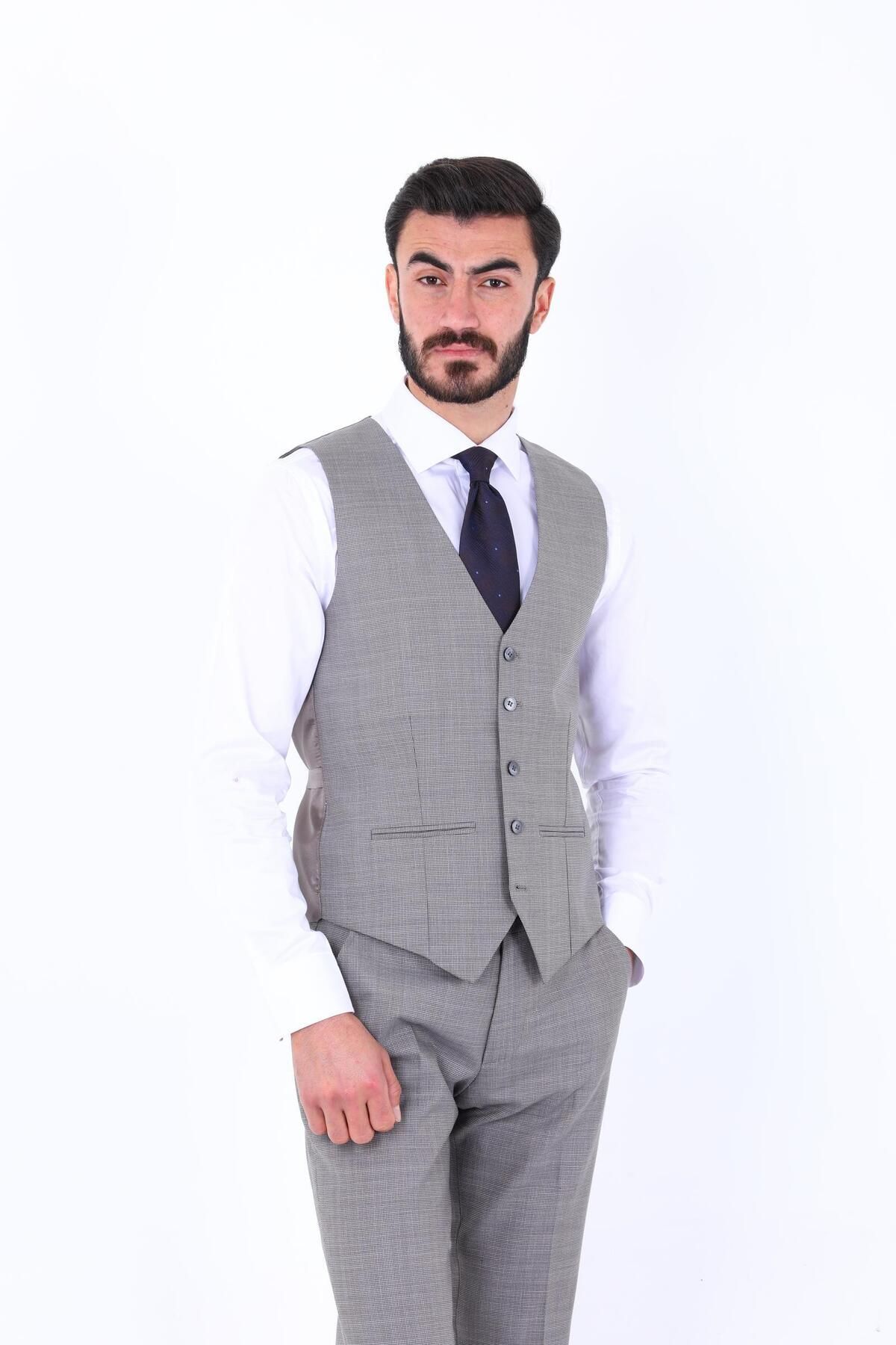 Kadir Büyükkaya imzasını taşıyan bu şık ve rahat yelekli erkek takım elbise, viskon ve likra dokusu ile üretilmiştir.