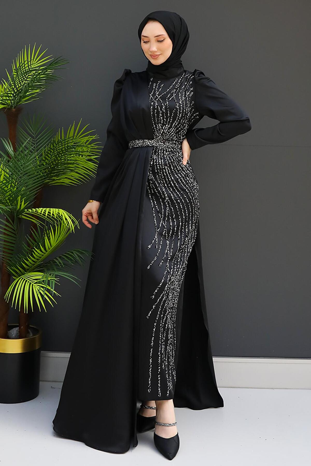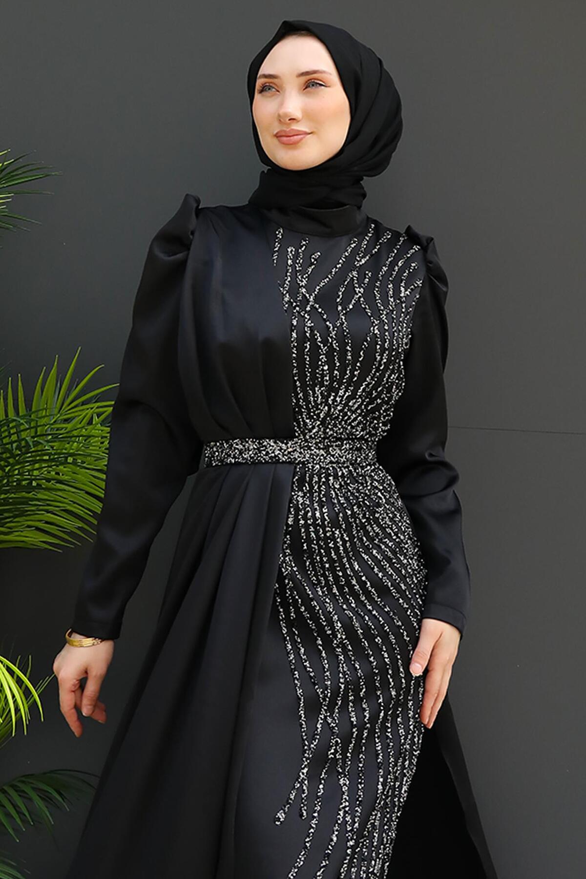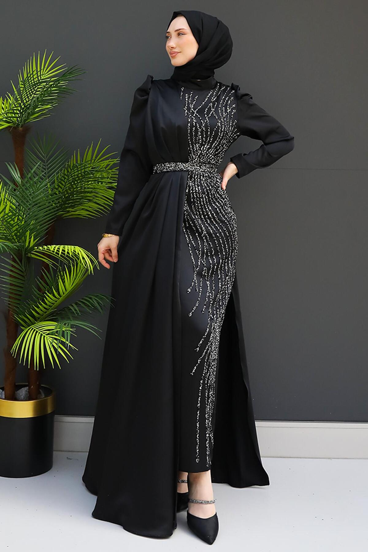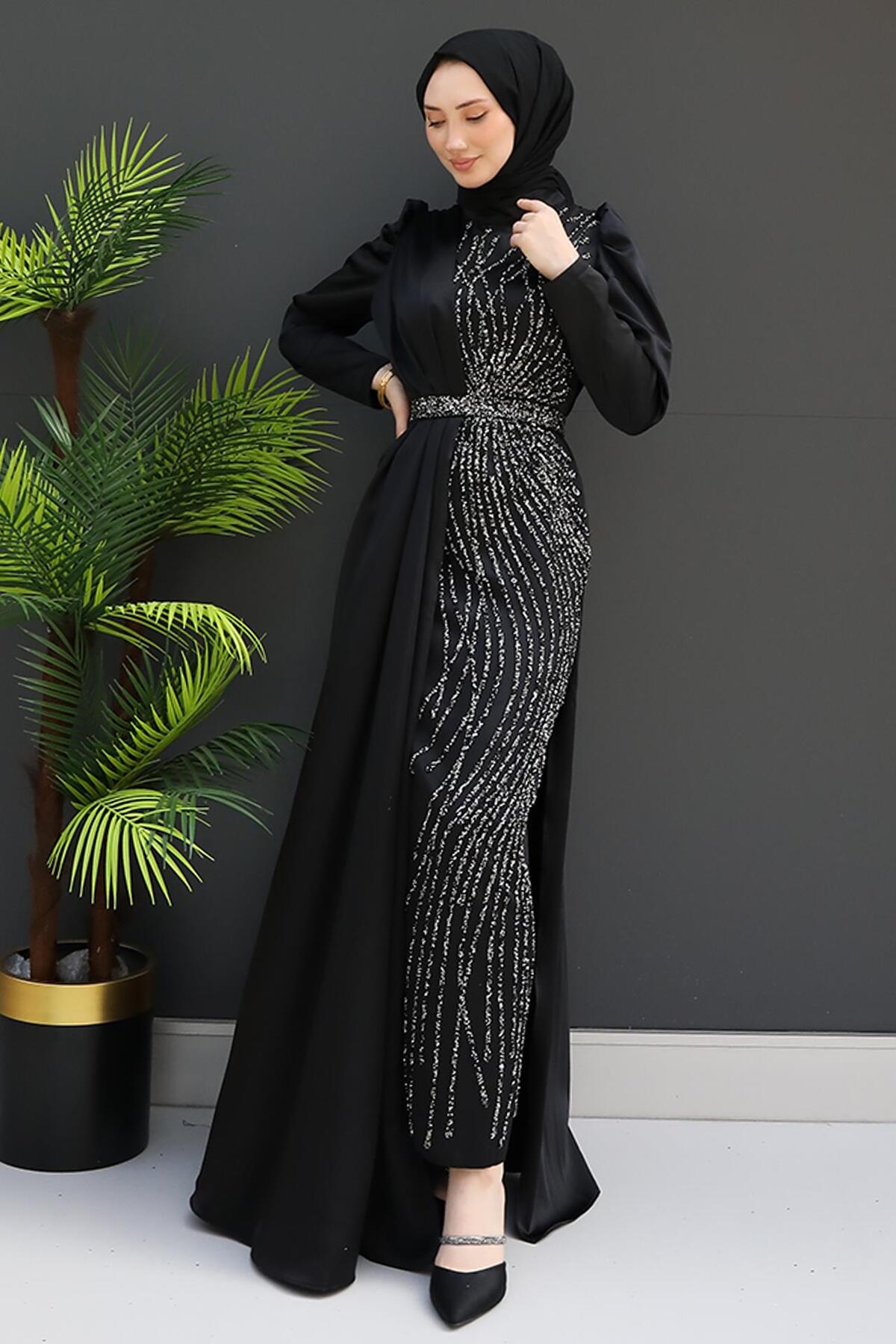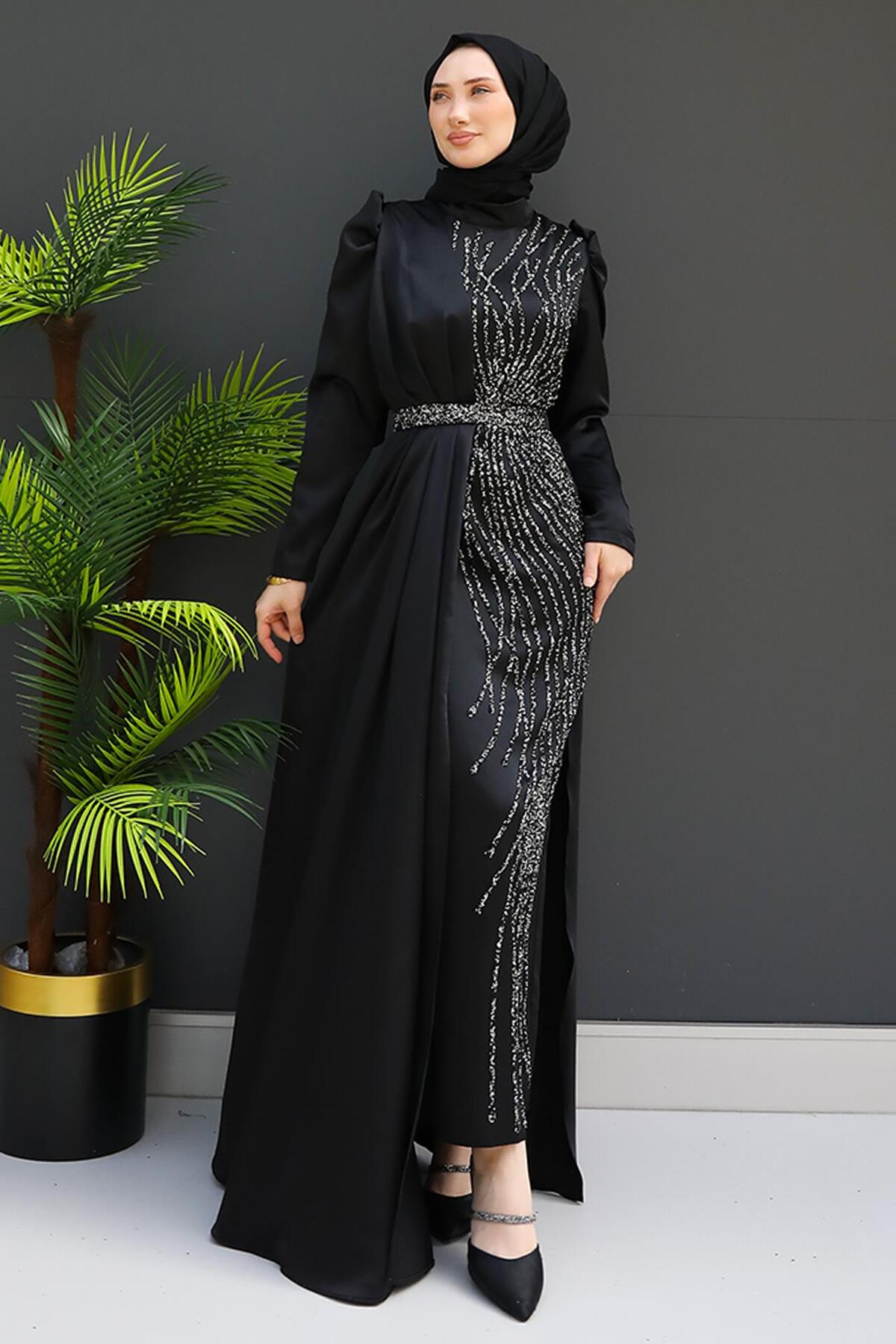 Tesettür giyim koleksiyonunun zarif bir parçası olarak, şıklığı ve konforu bir arada sunan siyah pelerin abiye