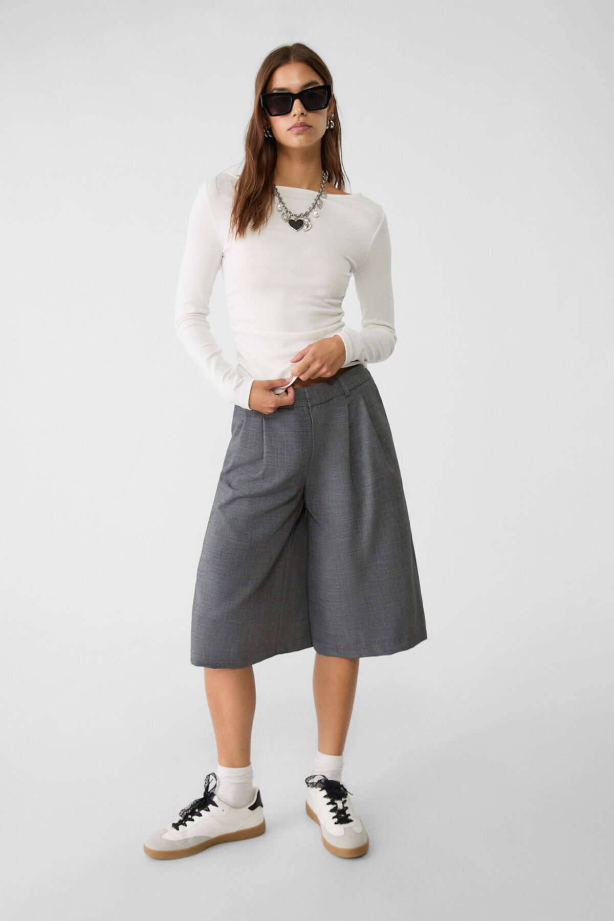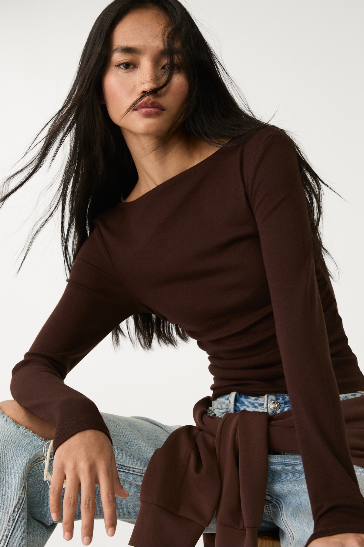 Yanları büzgülü, geniş yaka, uzun kollu t-shirt.