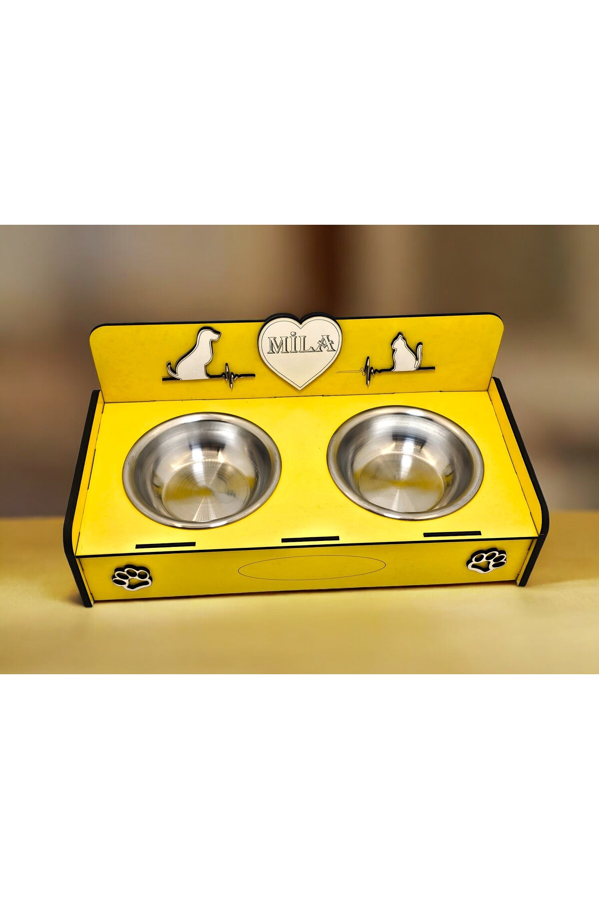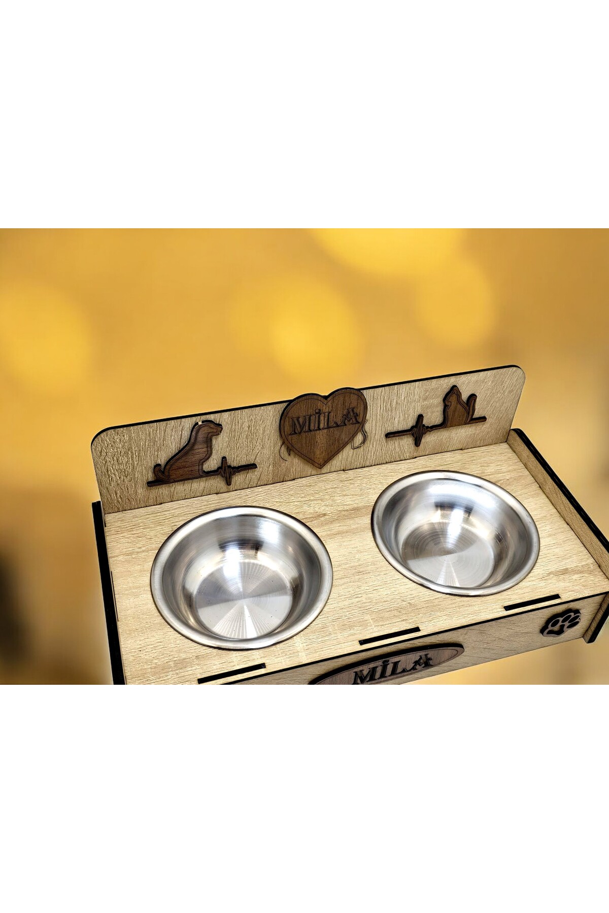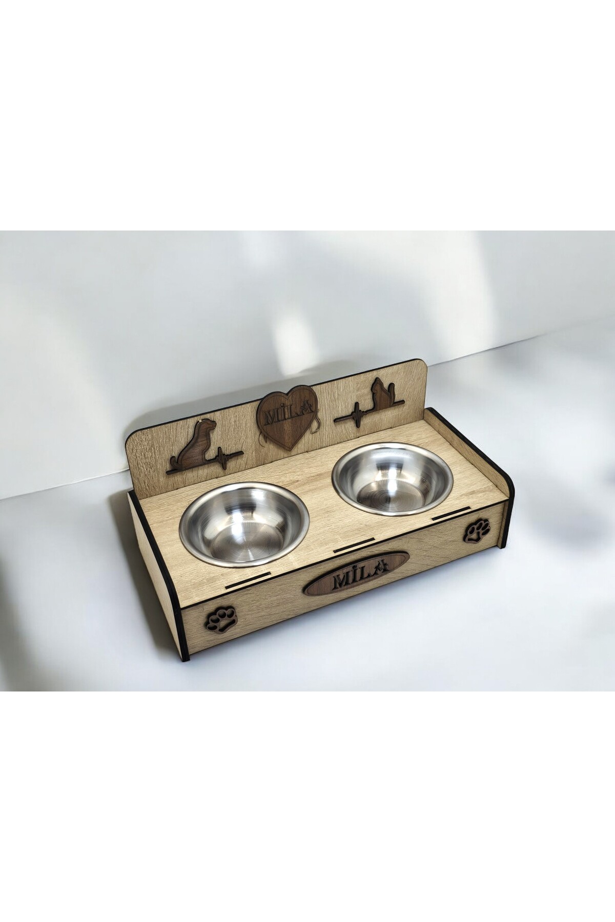 Emse Kedi Köpek Doğal Ahşap Çelik Mama Su kabı İsim Yazılabilir Hediyelik Özelleştirilebilir