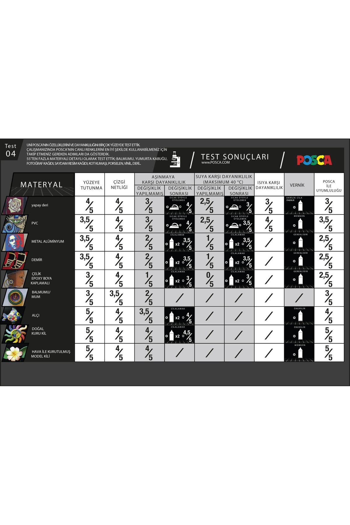 SU BAZLI OLDUĞU İÇİN SAĞLIĞA UYGUNDUR Uni Posca su bazlı pigment kalemleri opak, canlı renkler üretir ve hemen hemen her yüzeyde yazabilir: kağıt, karton, aydınger kağıdı, taş, kil, çimento, plastik, metal, ahşap, kumaş, cam, kanvas ve daha fazlası.