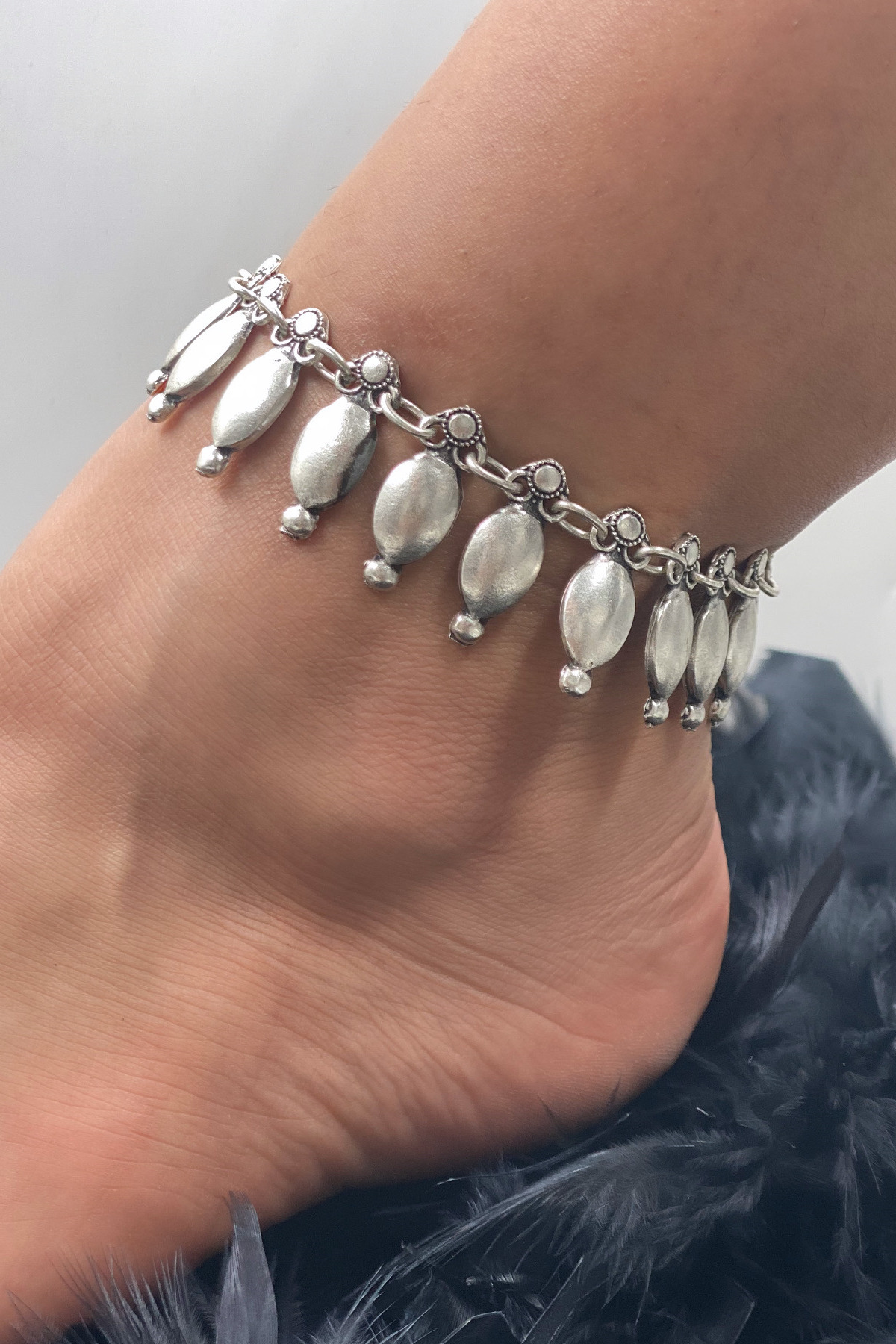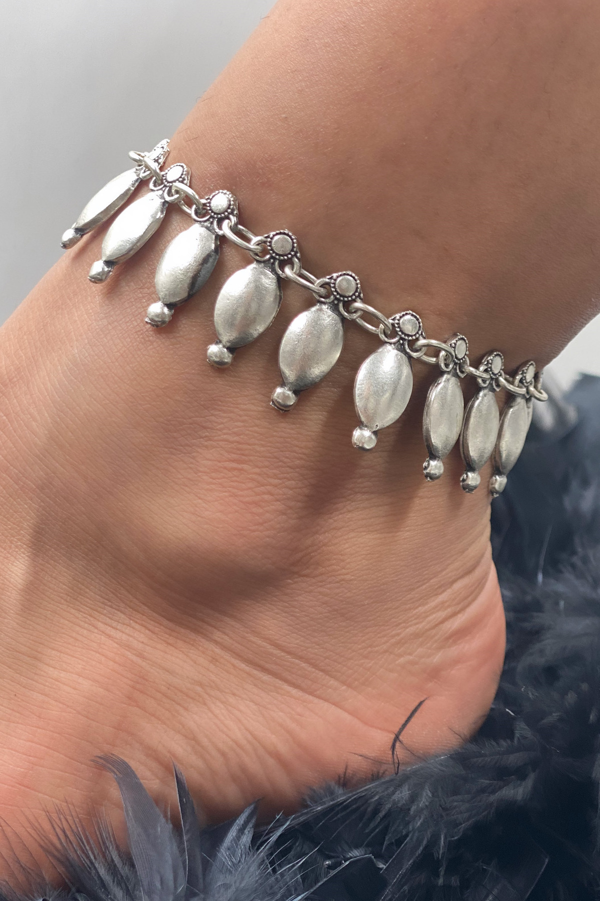 Zamansız tasarımıyla gençlerin enerjisini yansıtan antik eskitme gümüş kaplama halhal, stilinizi tamamlayacak şık bir aksesuardır