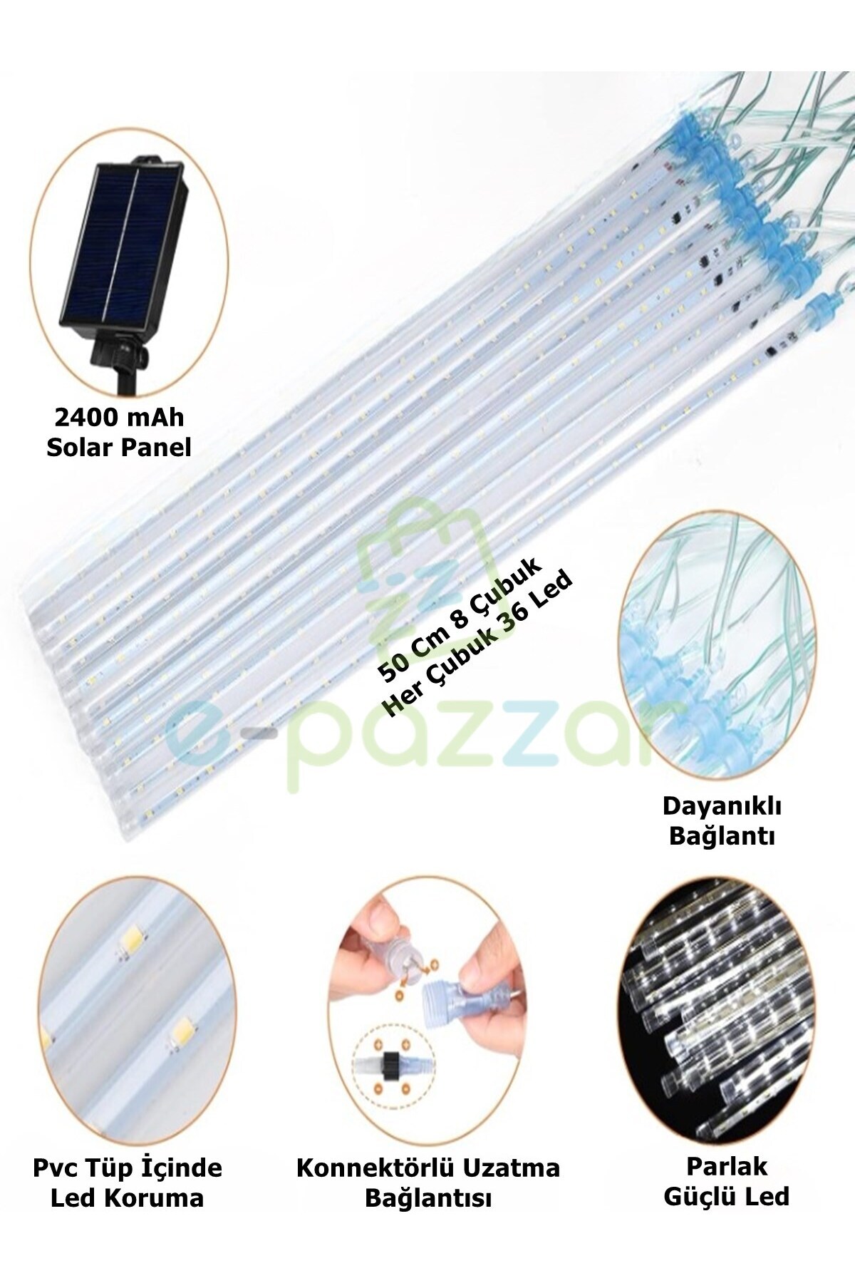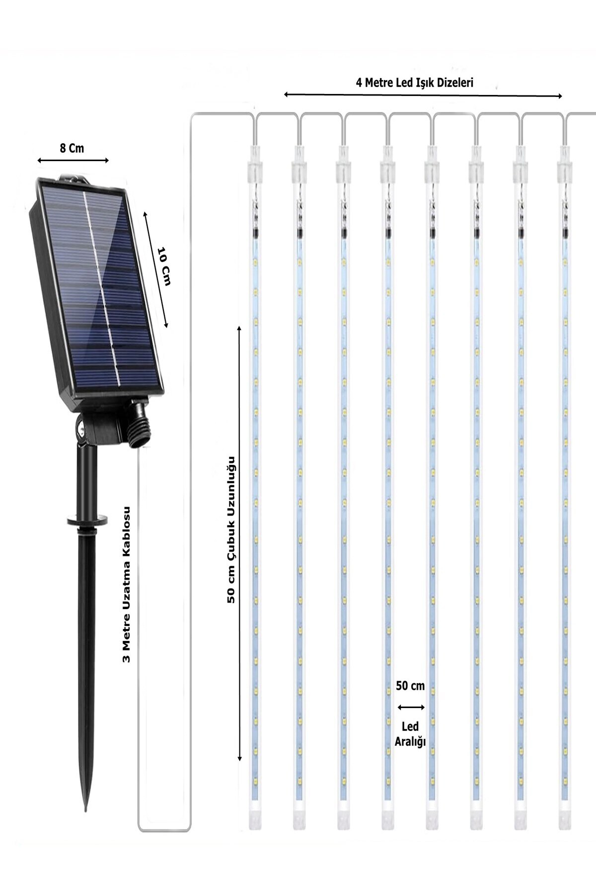 Solar Panelli Fonksiyonlu 288 Led 4 Mt. 8 Çubuk Günışığı Meteor Işık Dizeleri Led Aydınlatma