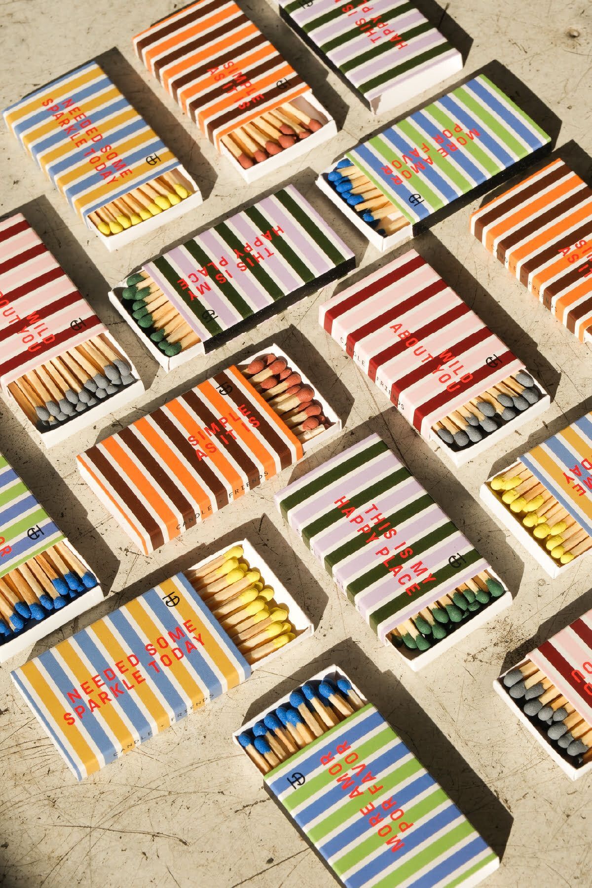 Farklı mottolar, desenler ve renkli uçlu kibrit çöplerinden oluşan bu kibrit kutularını kendinize veya sevdiğiniz birine hediye edin! Yaklaşık olarak 18-20 adet 5cm uzunluğunda kibrit içermektedir.