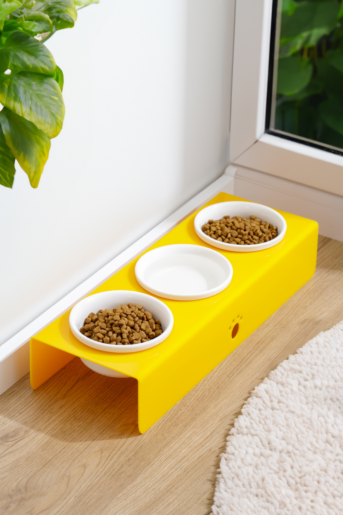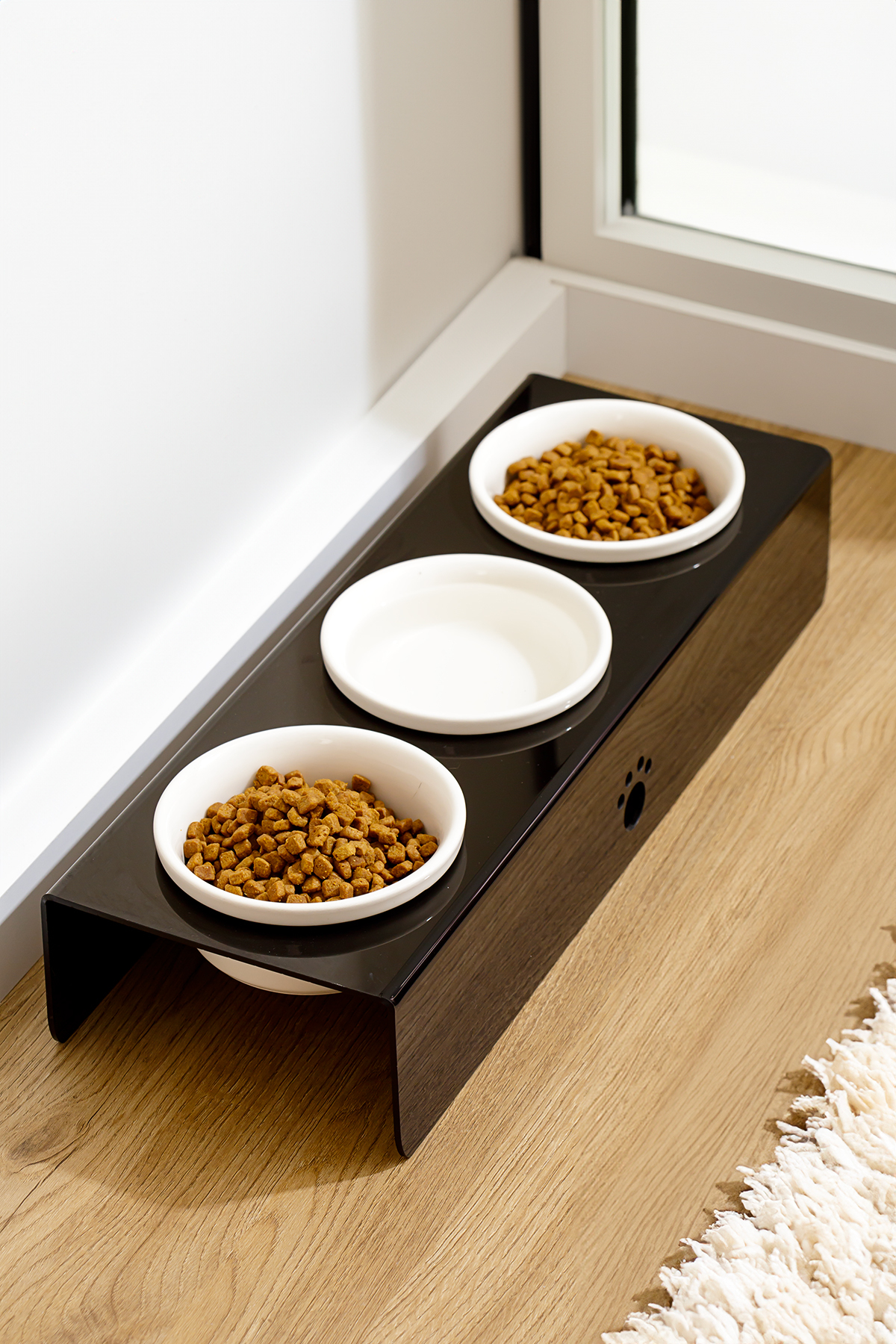 Pati Desenli Şeffaf Pleksi Ve Seramik Üçlü Mama Kabı 44x15 Cm