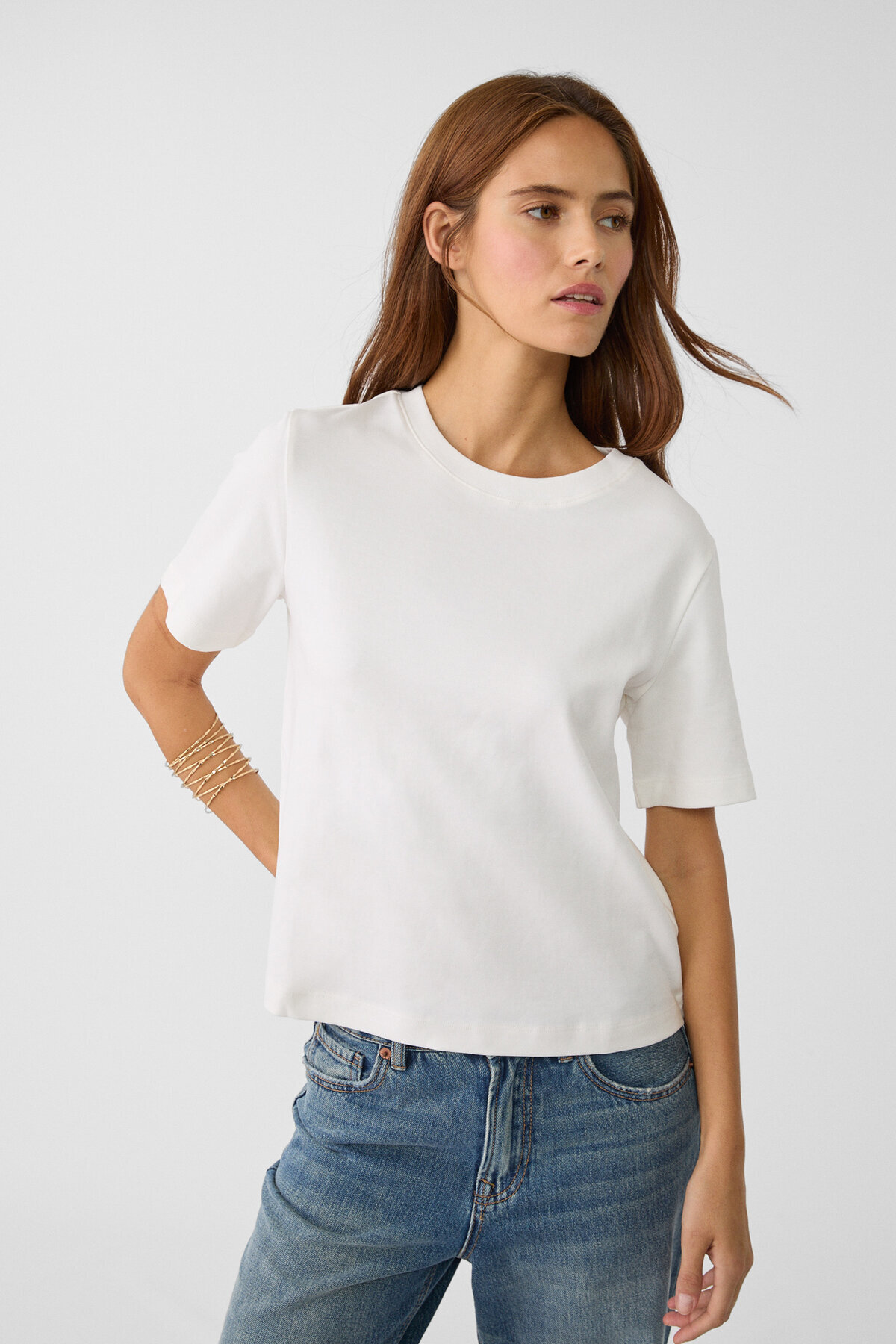 Pamuklu, kısa kollu, bisiklet yaka t-shirt.