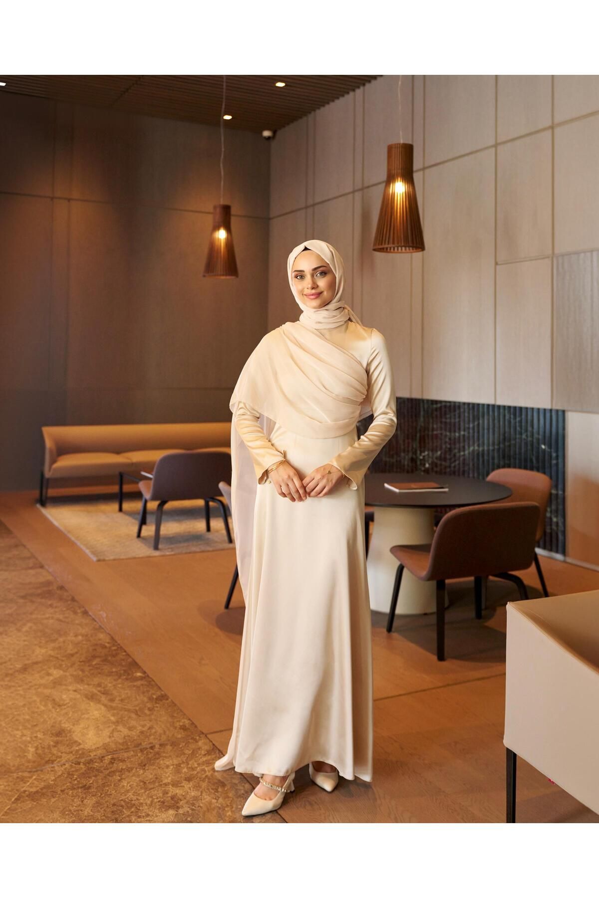Saten kumaşın zarif dokusu ve pelerin detayı ile şıklığınızı ön plana çıkarın