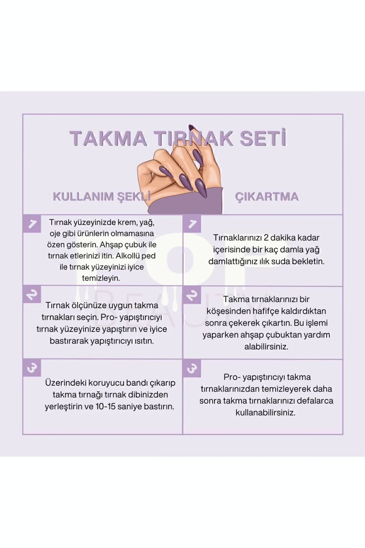 Ürün içeriği: •24 adet farklı beden ve desenli POP Beauty tırnak •1 adet ahşap çubuk •1 adet alkol ped •1 adet törpü •24’lü pro-yapıştırıcı Kullanım şekli: 1.Ahşap çubuk ile tırnak etlerinizi itin.
