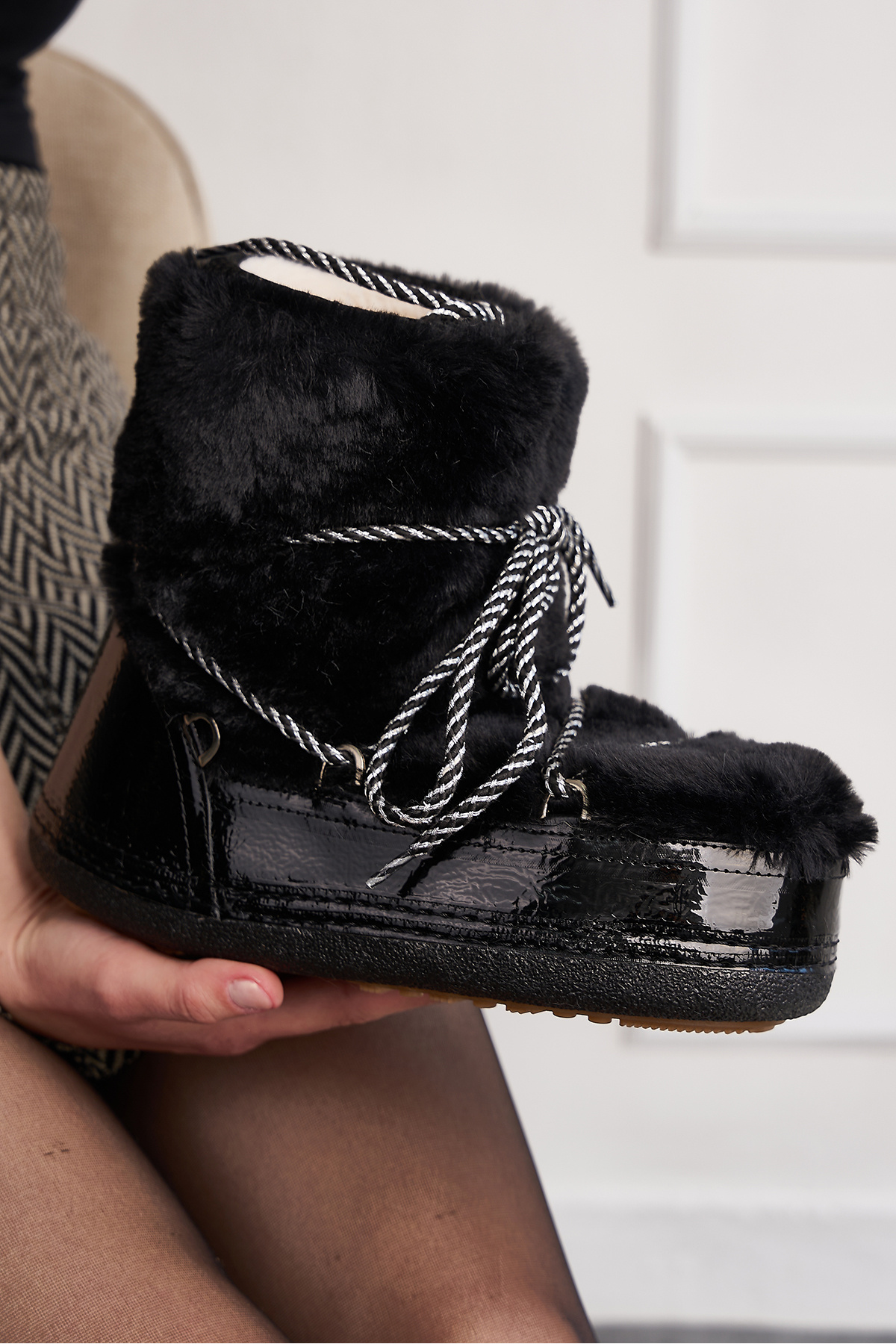 • İç tabanı dahil olmak üzere kürklü ve suni peluş malzemeden imal edilmiştir.