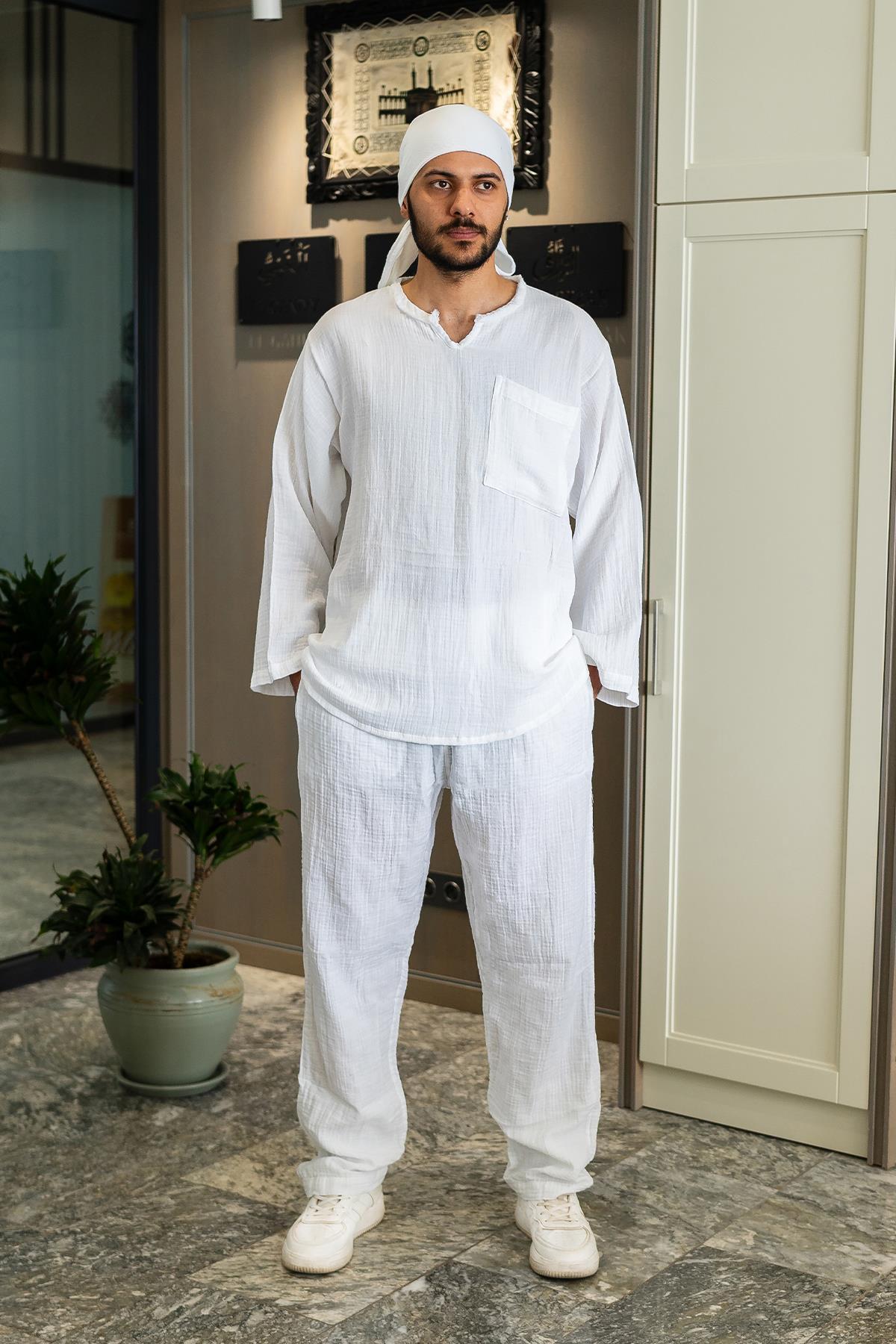 Müslin Erkek Bol Hac Umre Namaz Takım Beyaz