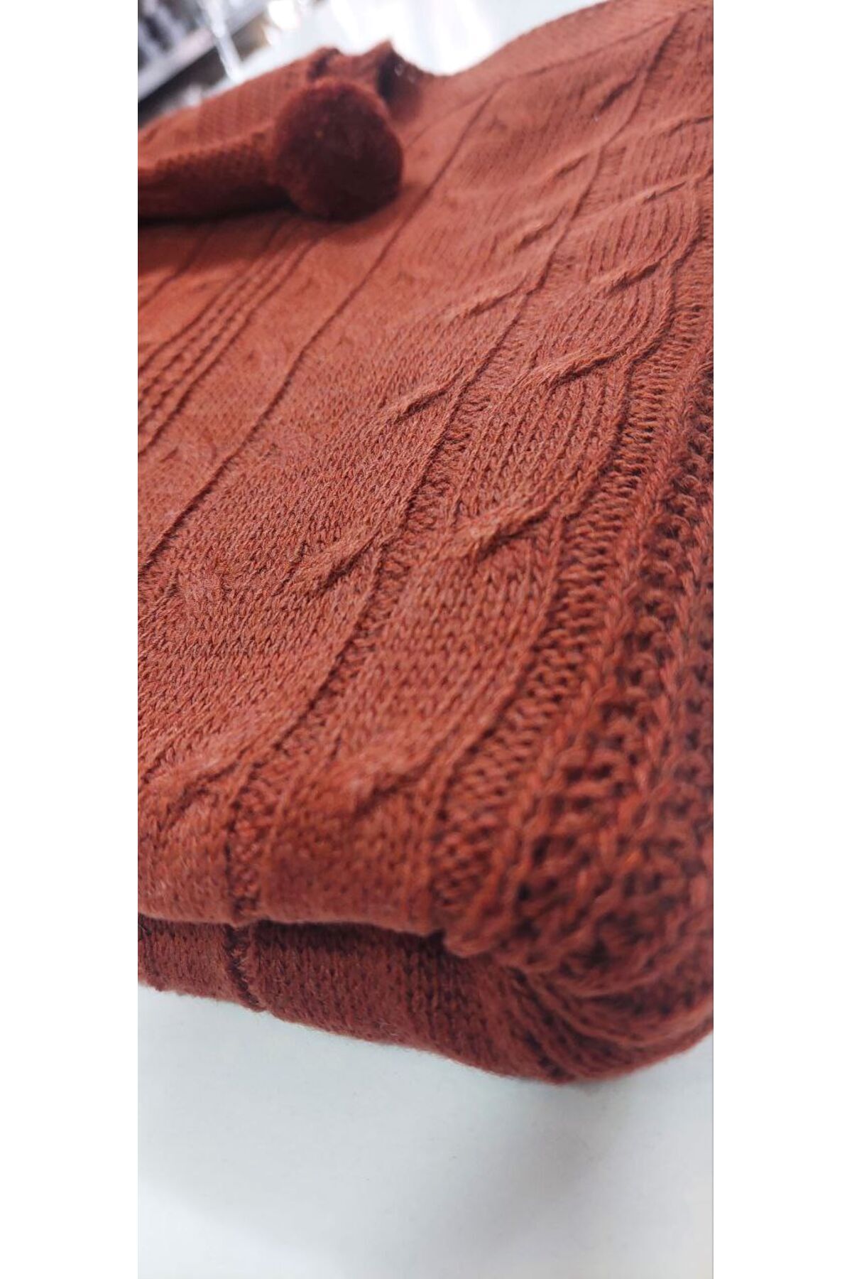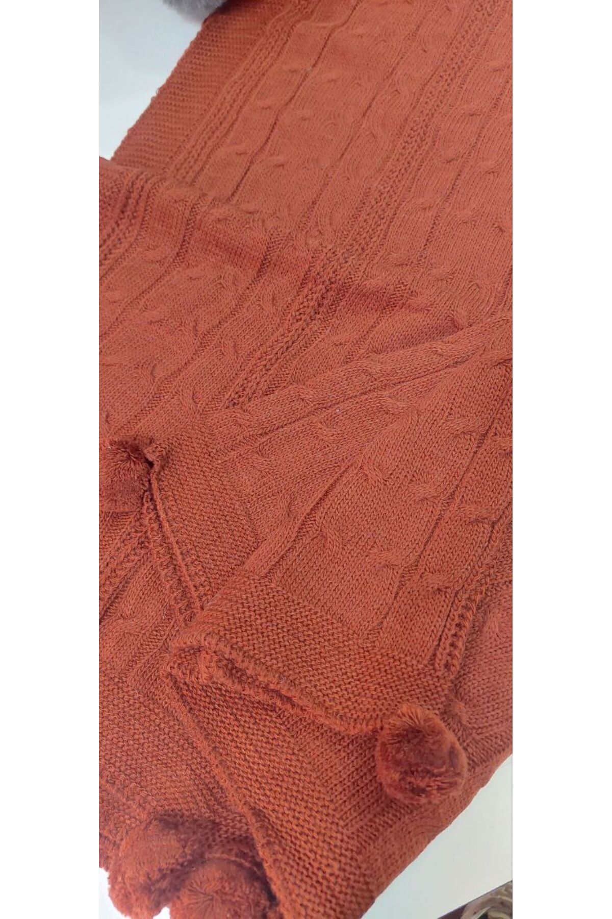 Ölçü : 125 x 165 cm Akrilik - Pamuk 2 tarafı ponponlu diz battaniyesidir.