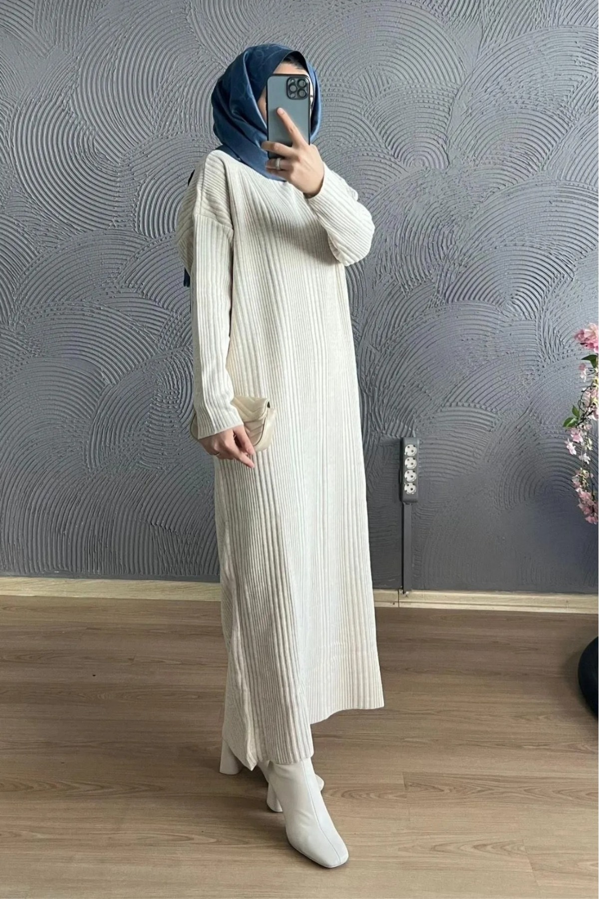 Uzun kol boyu soğuk havalarda ekstra koruma sağlarken, kazak elbise siluetiyle rahat hareket