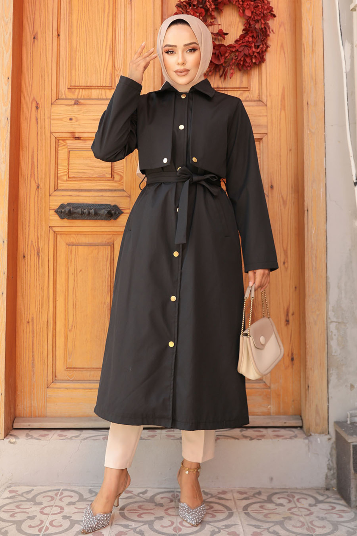 Düğmeli Siyah Tesettür Trençkot 62131S