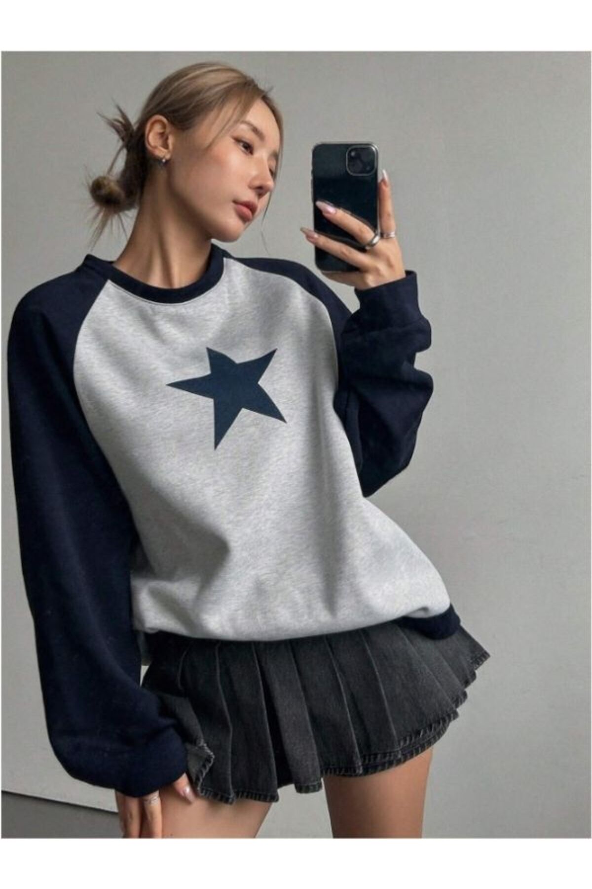 Kadın Oversize Yıldız Baskılı Lacivert Reglan Kollu Gri Sweatshirt