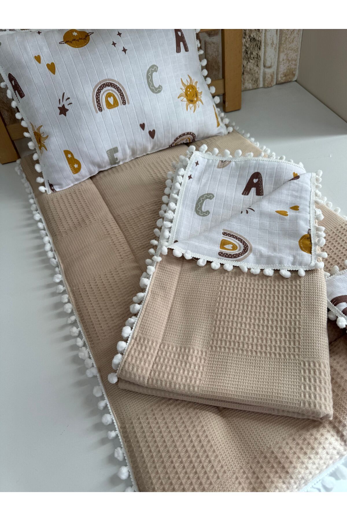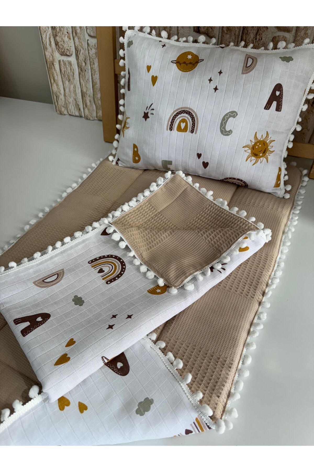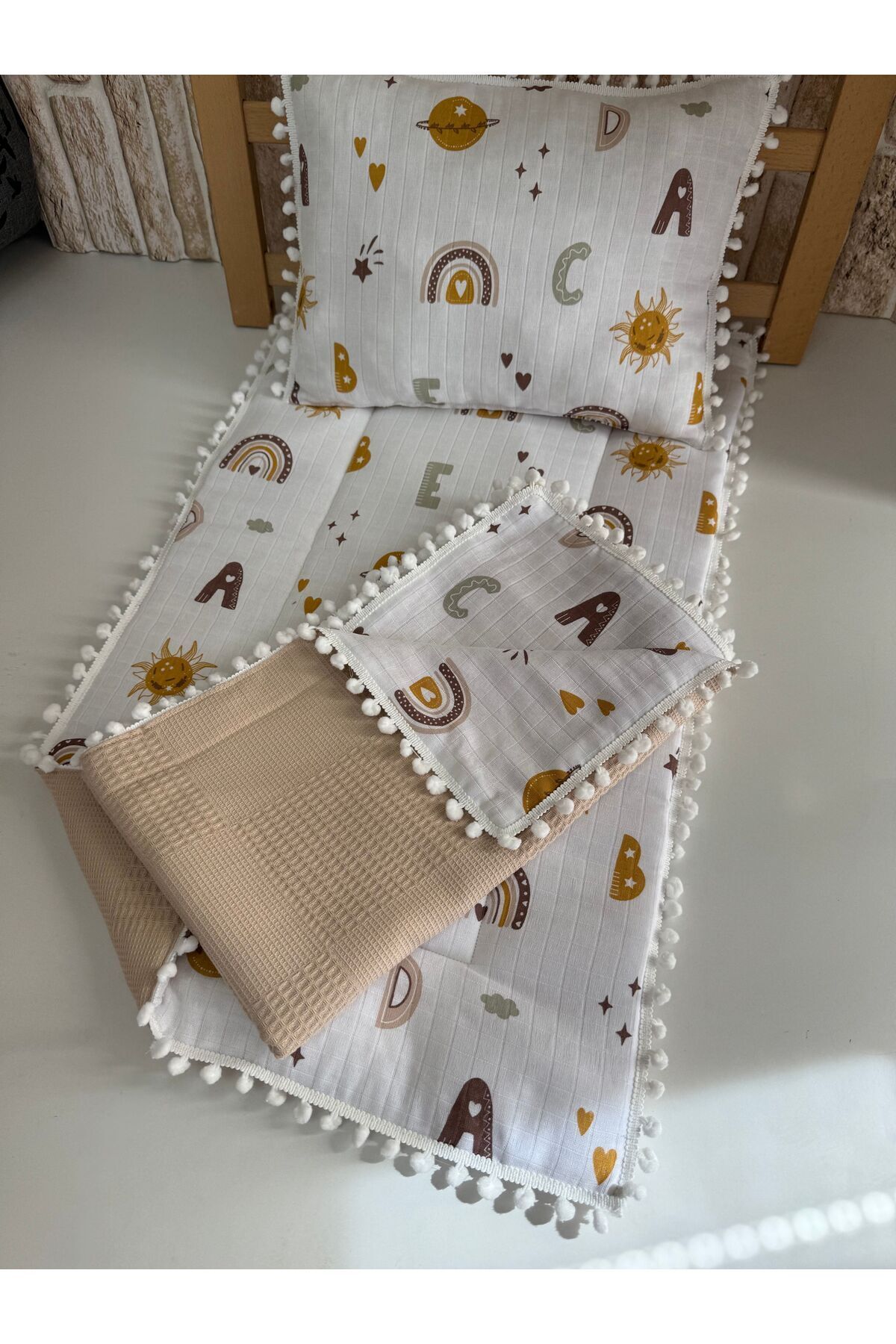 %100 pamuk bir tarafı birebir tarafı müslin kumaş 3 parça alt açma örtüsü yastık ve battaniye seti Makina da hassas programlı yıkanabilir Birinci elyaflı minder ve yastık dolgusu Sererek kurutma yapınız.