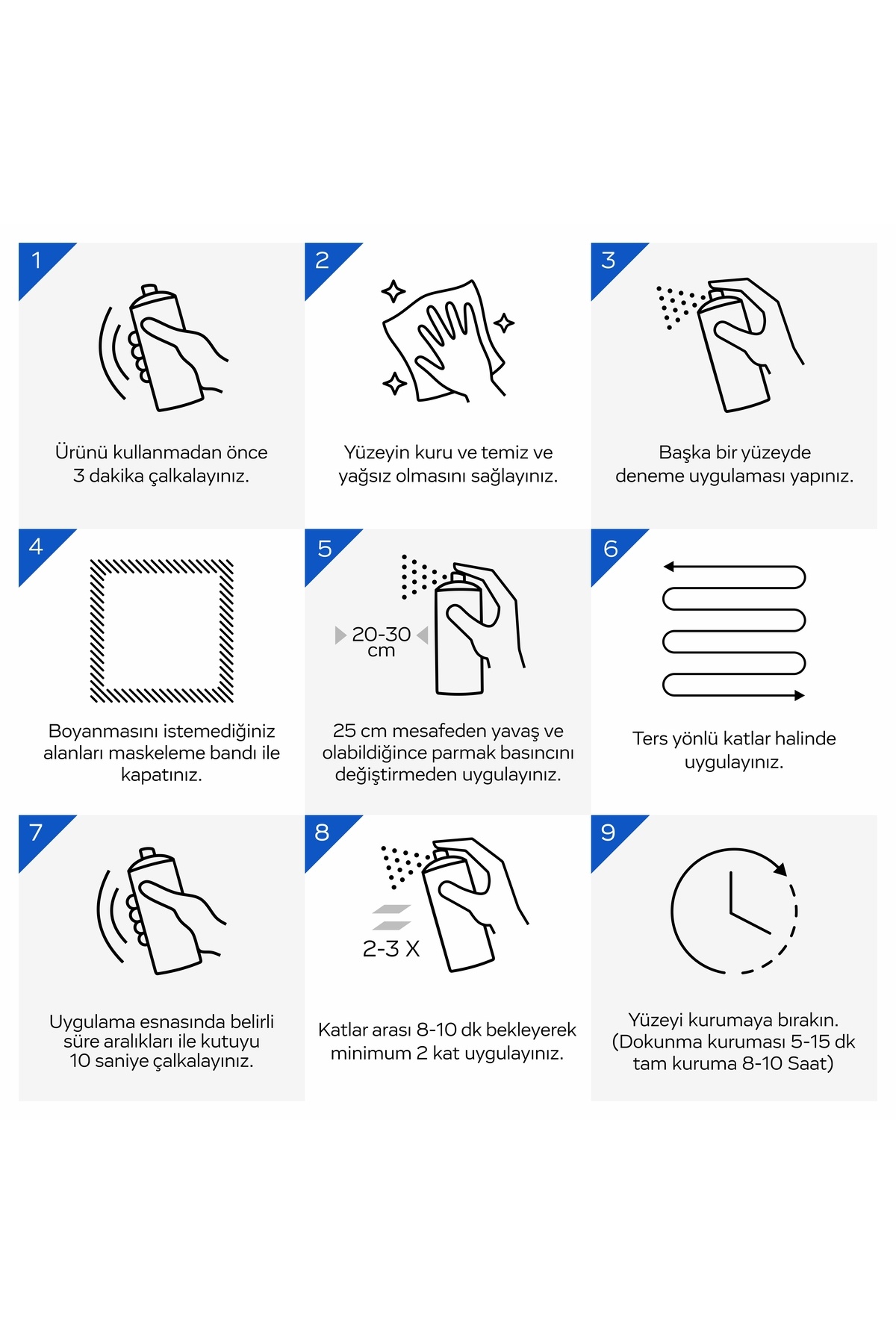 ÖZELLİKLER Pratik kullanım Üstün yapışma %100 Akrilik RAL Kodları ile uyumlu Maksimum renk kararlılığı Düşük koku Hızlı kuruma Parlak ve pürüzsüz bitiş İç ve dış mekan kullanımına uygun Zorlu hava koşullarına, solmaya ve çizilmeye karşı dirençli Kurşun içermez AMBALAJ VE DOLUM Her renk için kolay anlaşılabilir özel tasarım 400 ml.