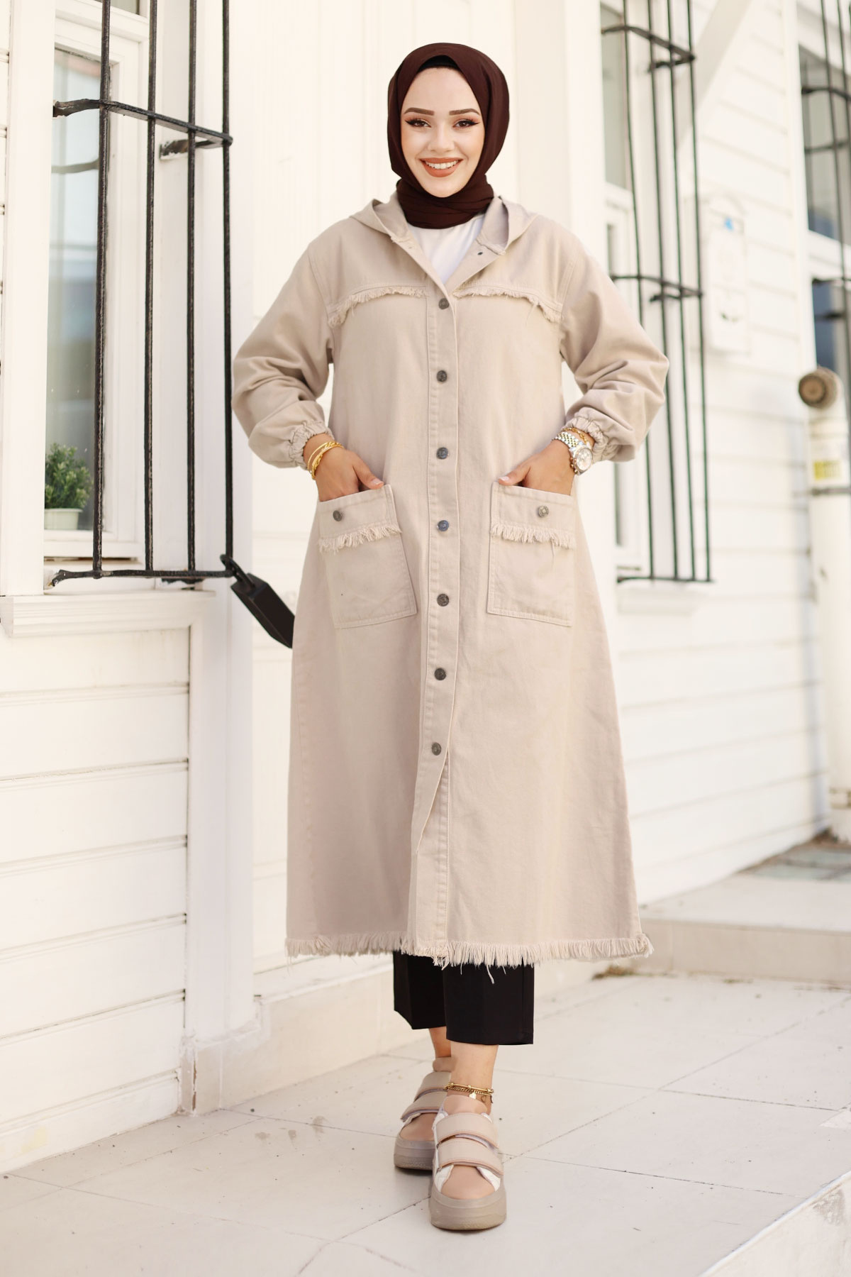 Püsküllü Uzun Kot Kap TSD240821 Haki Kahverengi Özellikleri Kumaş Özelliği : Kot kumaştan üretilmiştir.