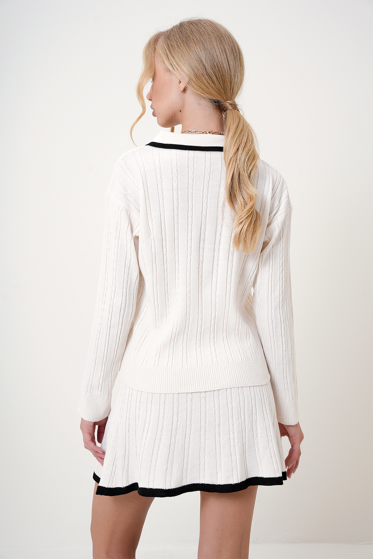 Şıklığı Ve Konforu Bir Arada Sunan Polo Yaka Düğmeli Triko Kazak Ve Etek İkili Takım, Gardırobunuzun Vazgeçilmez Bir Parçası Olacak. Polo Yaka Tasarımı, Hem Klasik Hem De Modern Bir Görünüm Sunar, Düğme Detayları İse Zarif Bir Dokunuş Ekler. Yumuşak Triko Kumaşı, Hem Şık Hem De Rahat Bir Kullanım Deneyimi Sağlar. Etek, Uyumlu Bir Şekilde Tasarlanmış Olup, Vücut Hatlarını Nazikçe Saran Ve Şıklığınızı Tamamlayan Bir Kesime Sahiptir.