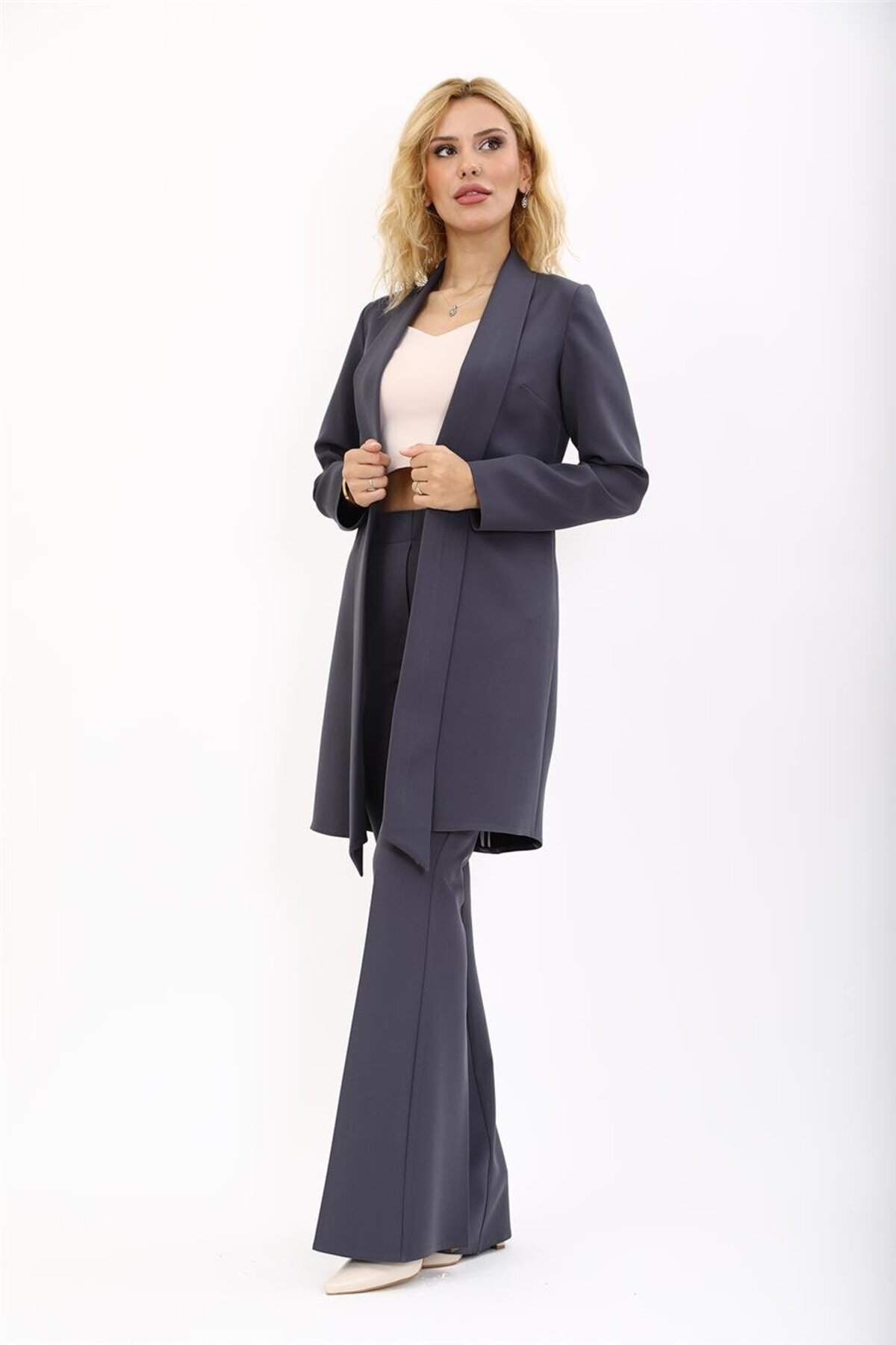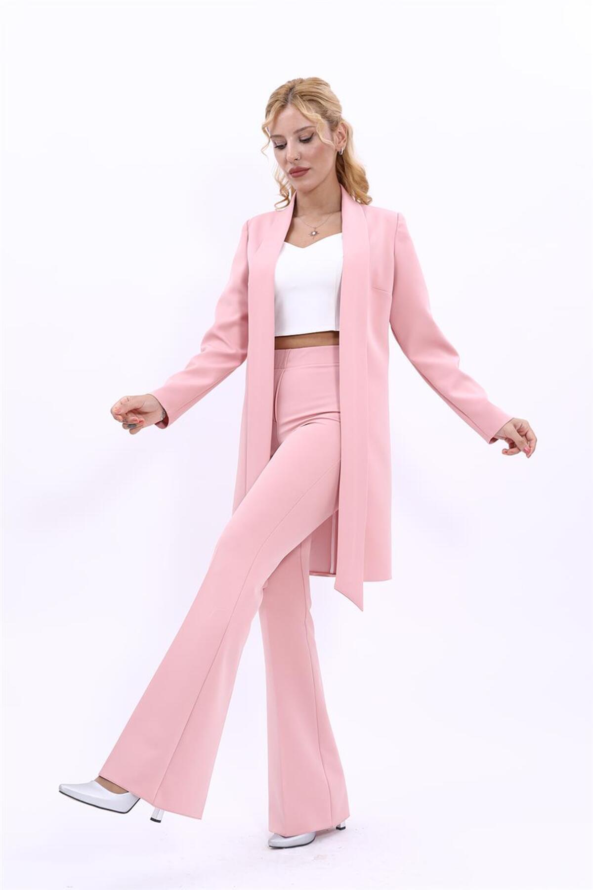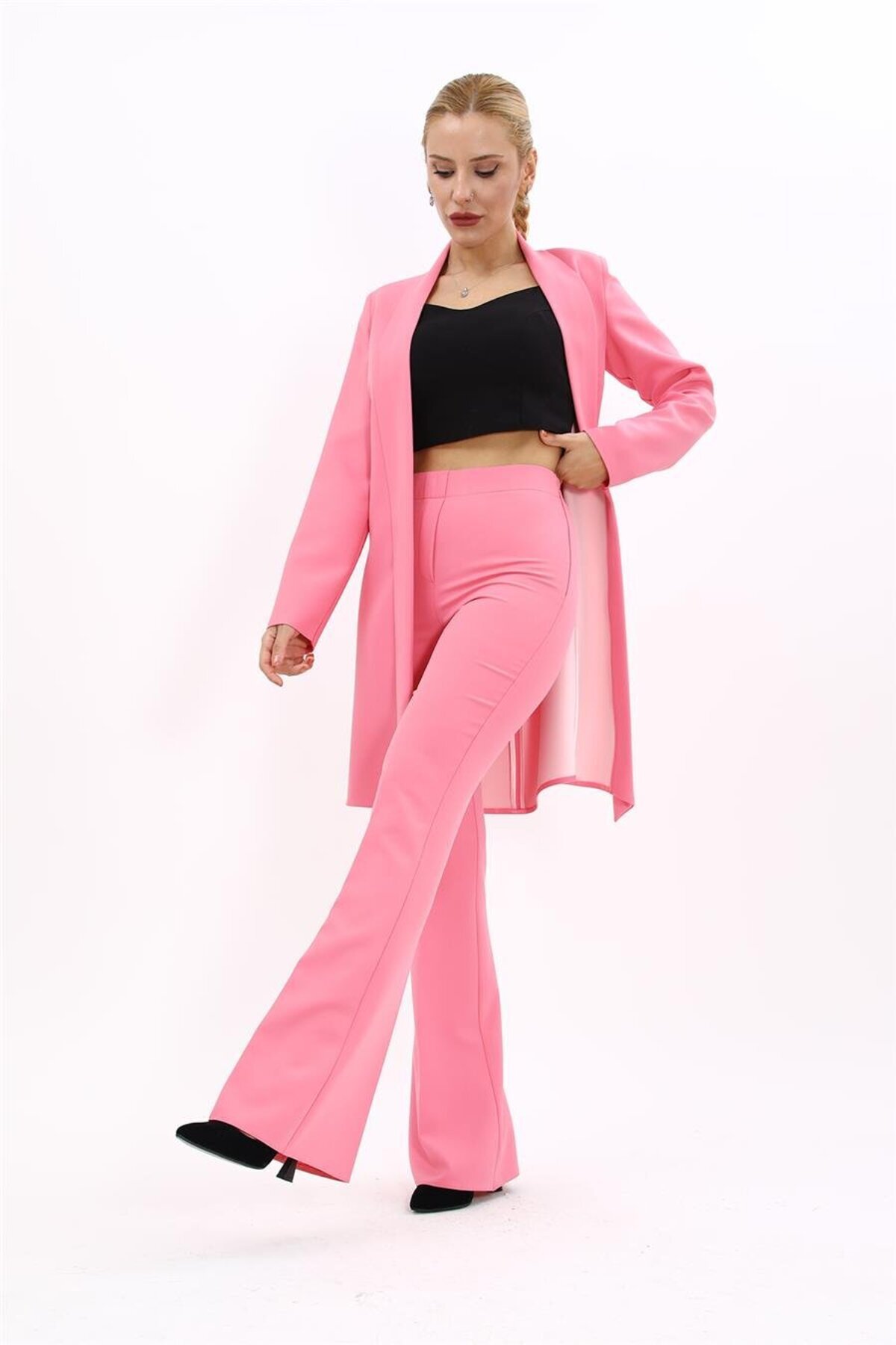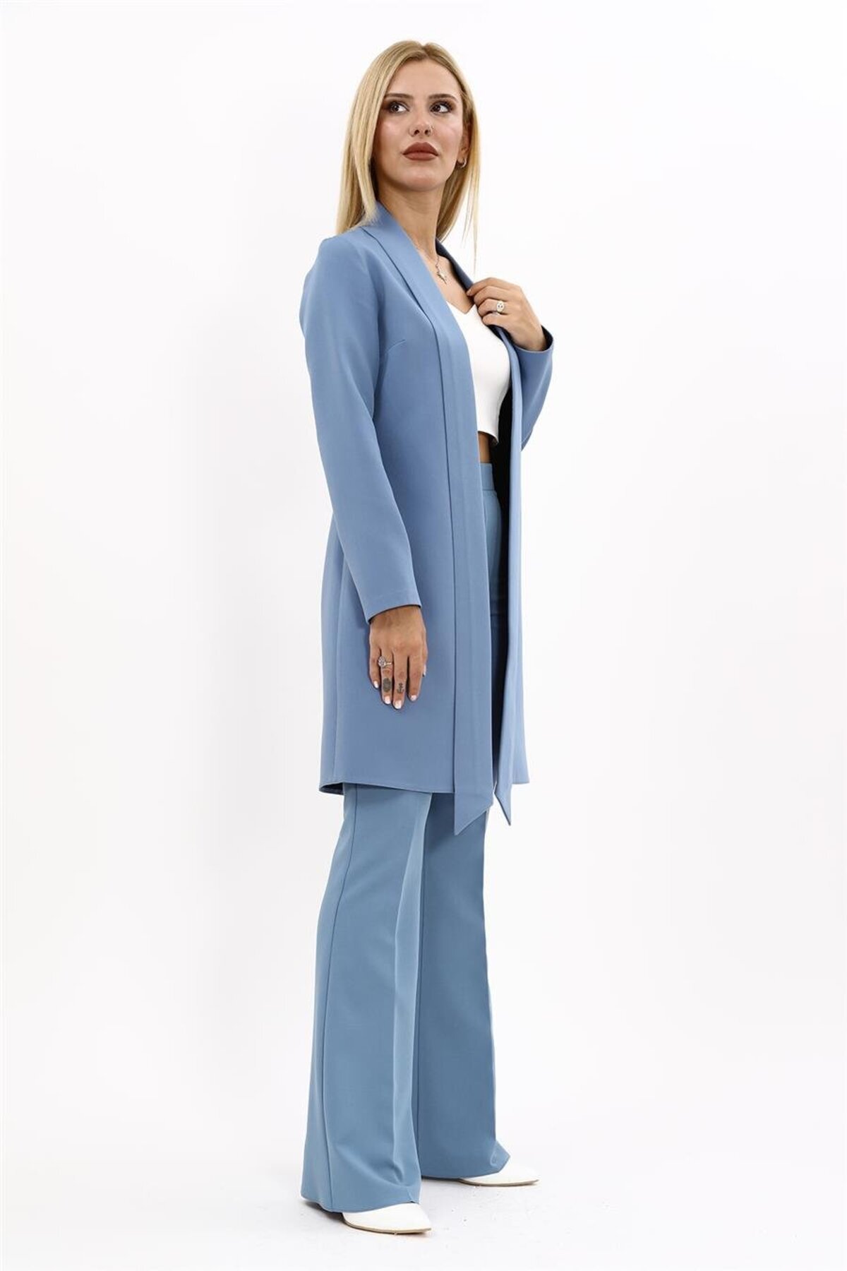 👗 Manken Ölçüleri: 36 Beden – Boy: 170 cm | Göğüs: 85 cm | Bel: 67 cm | Basen: 92 cm 💎 Astarsız uzun ceket ve ispanyol paça pantolon tasarımıyla ofiste veya özel davetlerde sofistike bir şıklık sağlar.
