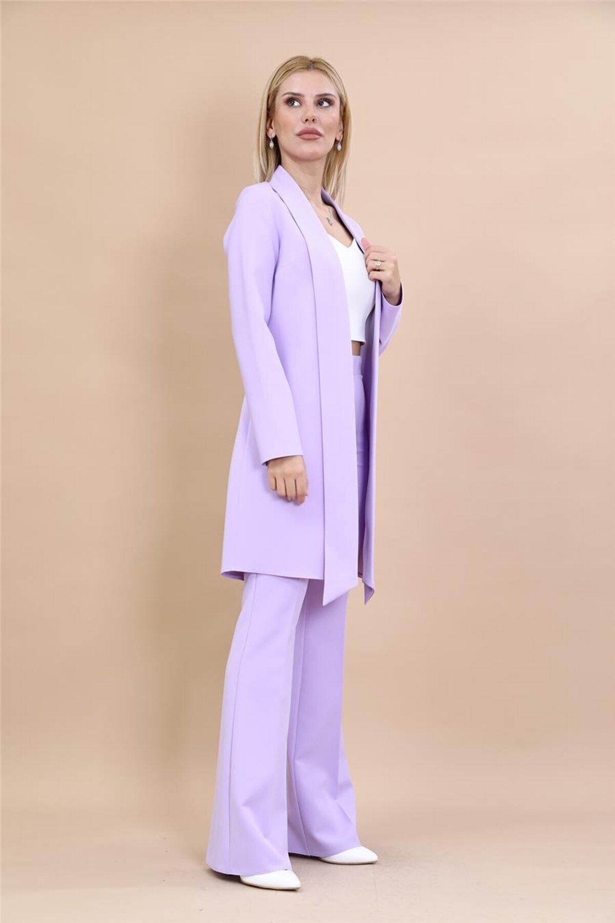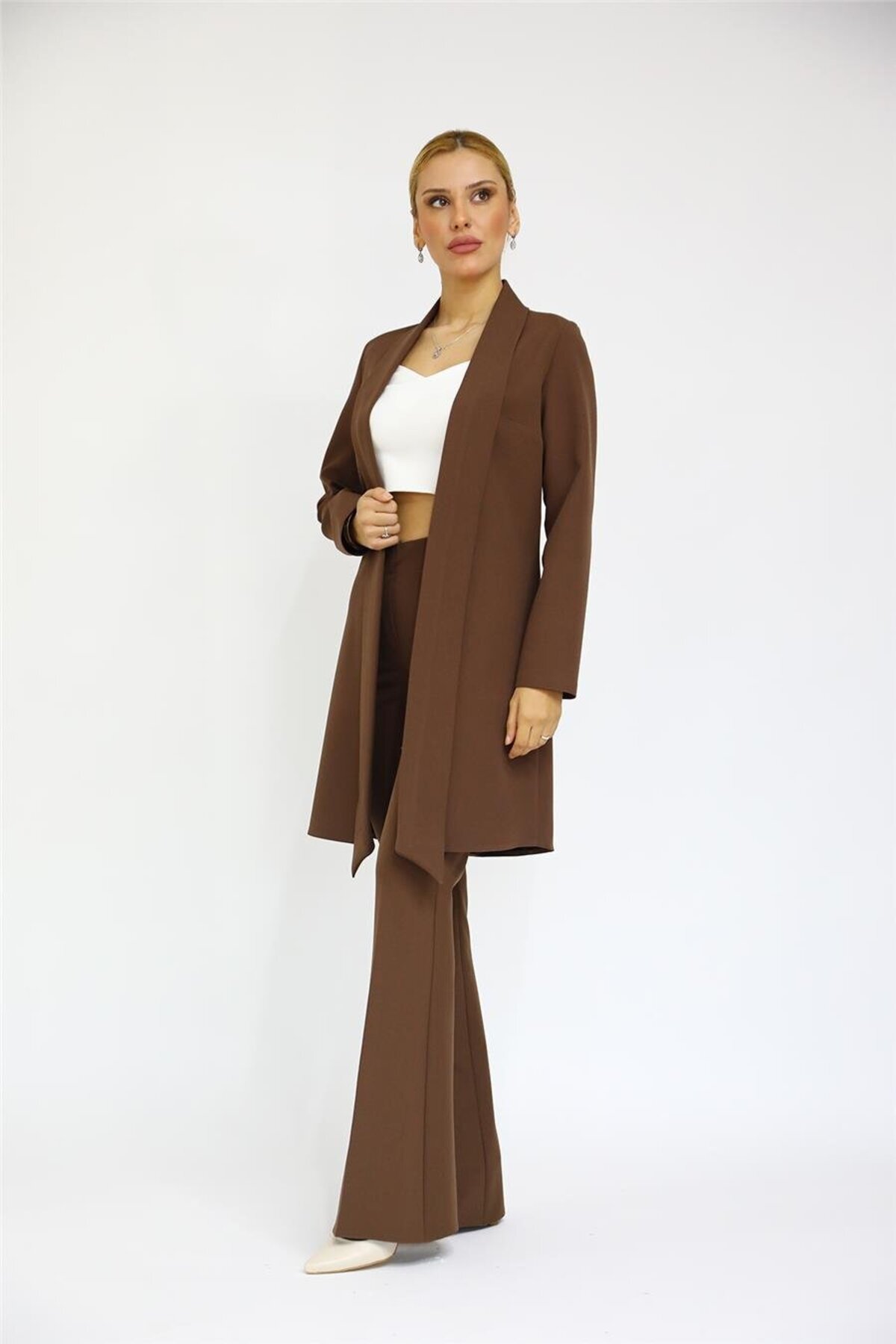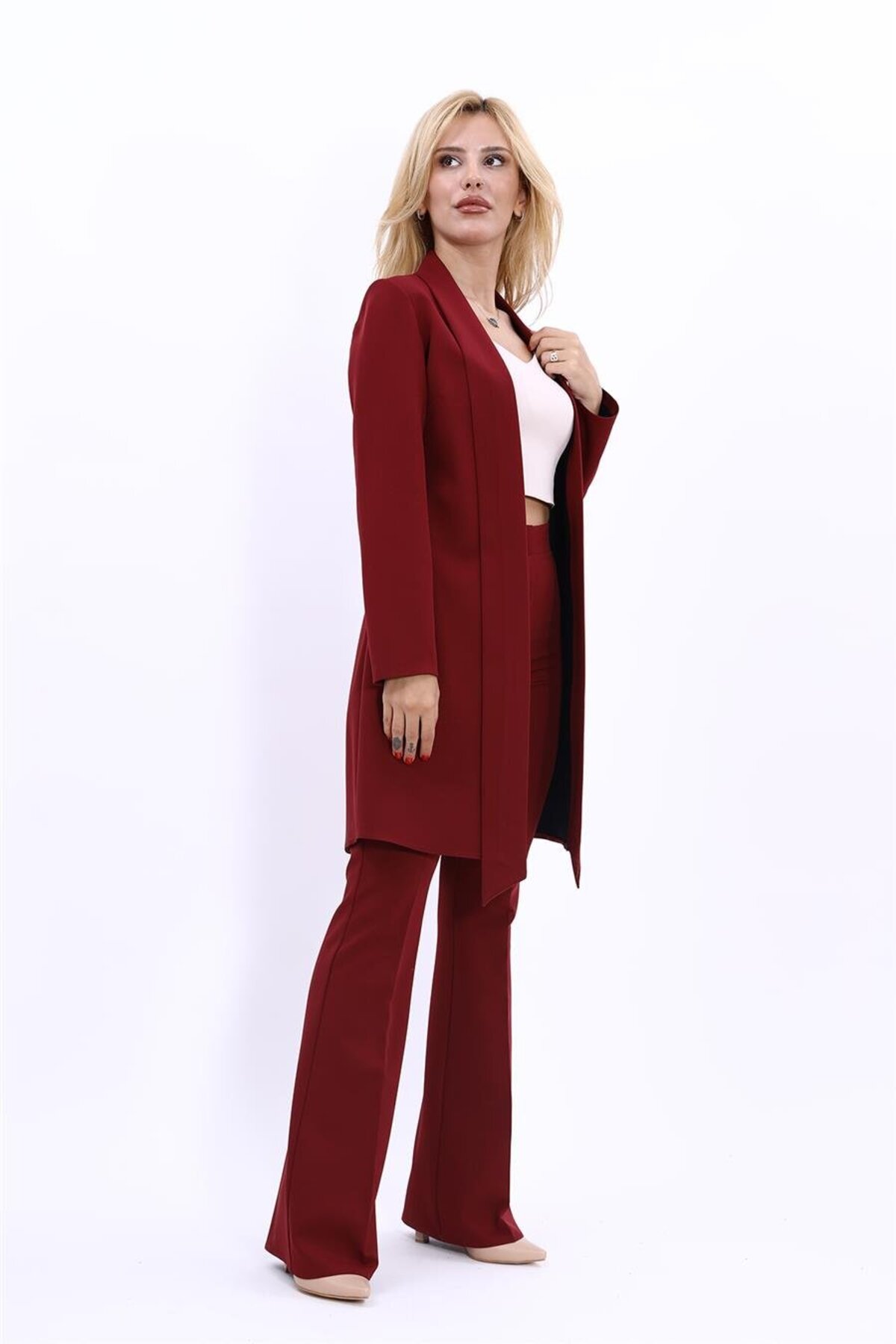 👗 Manken Ölçüleri: 36 Beden – Boy: 170 cm | Göğüs: 85 cm | Bel: 67 cm | Basen: 92 cm 💎 Astarsız uzun ceket ve ispanyol paça pantolon tasarımıyla ofiste veya özel davetlerde sofistike bir şıklık sağlar.