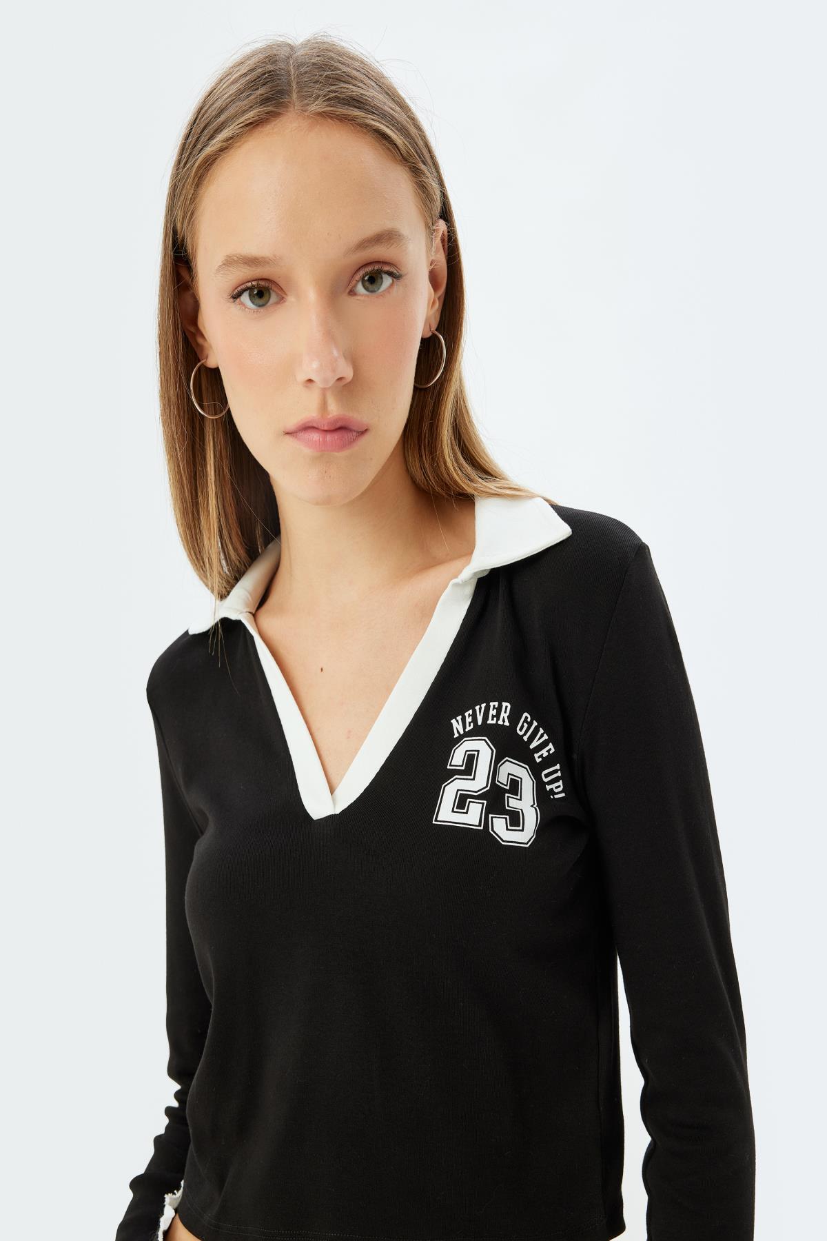 Polo yaka, crop, uzun kollu, kolej baskılı tişörtü üzerinizden çıkarmak istemeyeceksiniz! Konfor ve şıklığı bir araya getiren Koton tişört koleksiyonunu şimdi keşfedin! | Model Boy: 176 | Model Kalça: 88 | Model Üst: 57 | Model Bel: S | Model Göğüs: 77 | Model Jean: 27/32