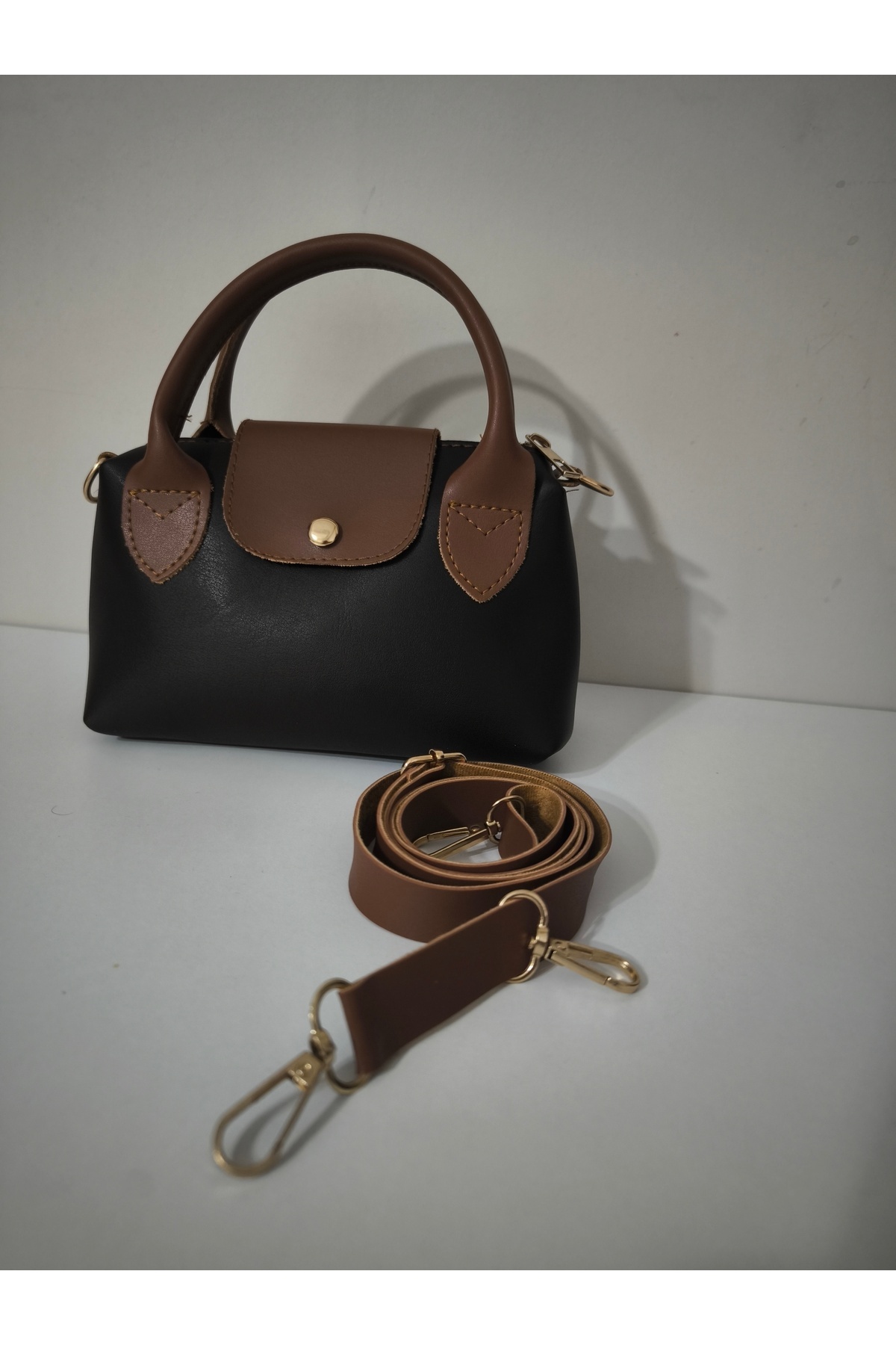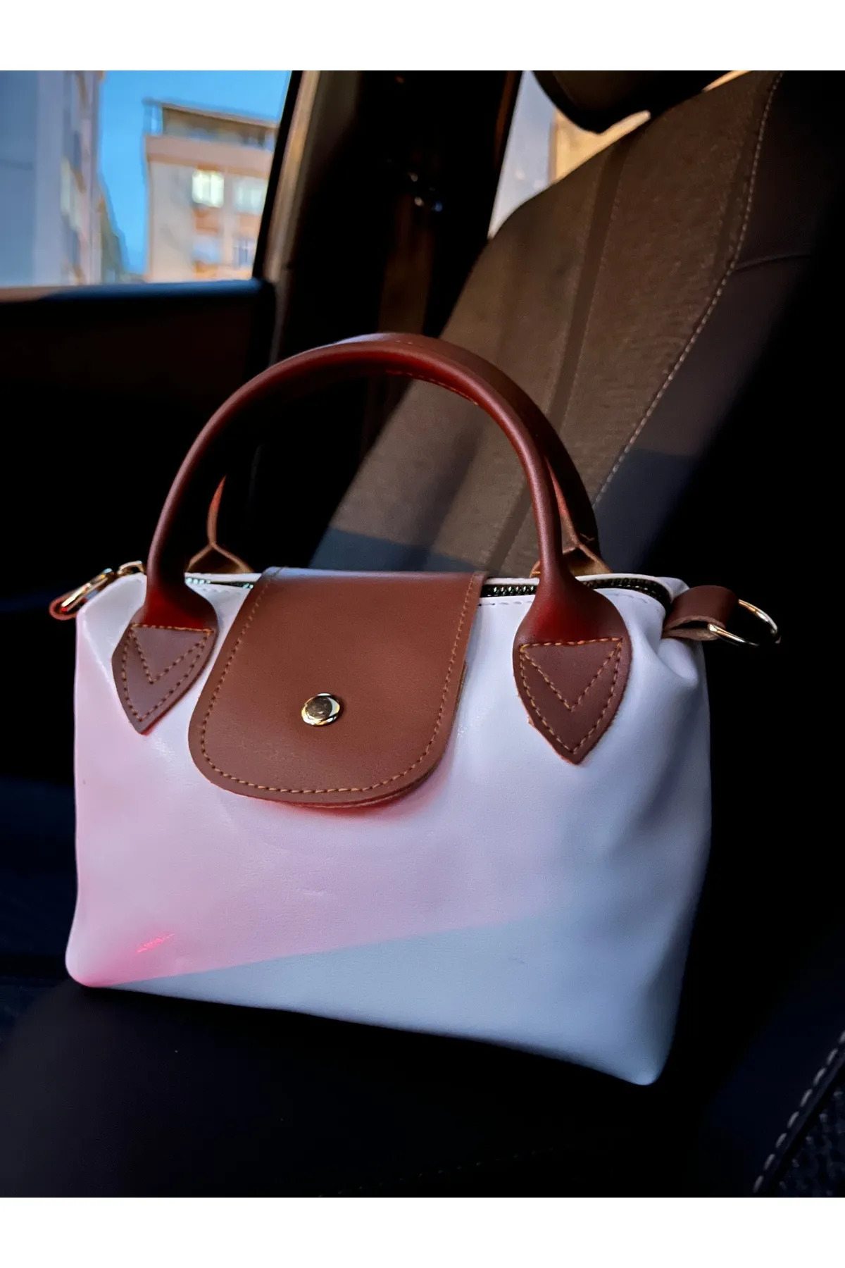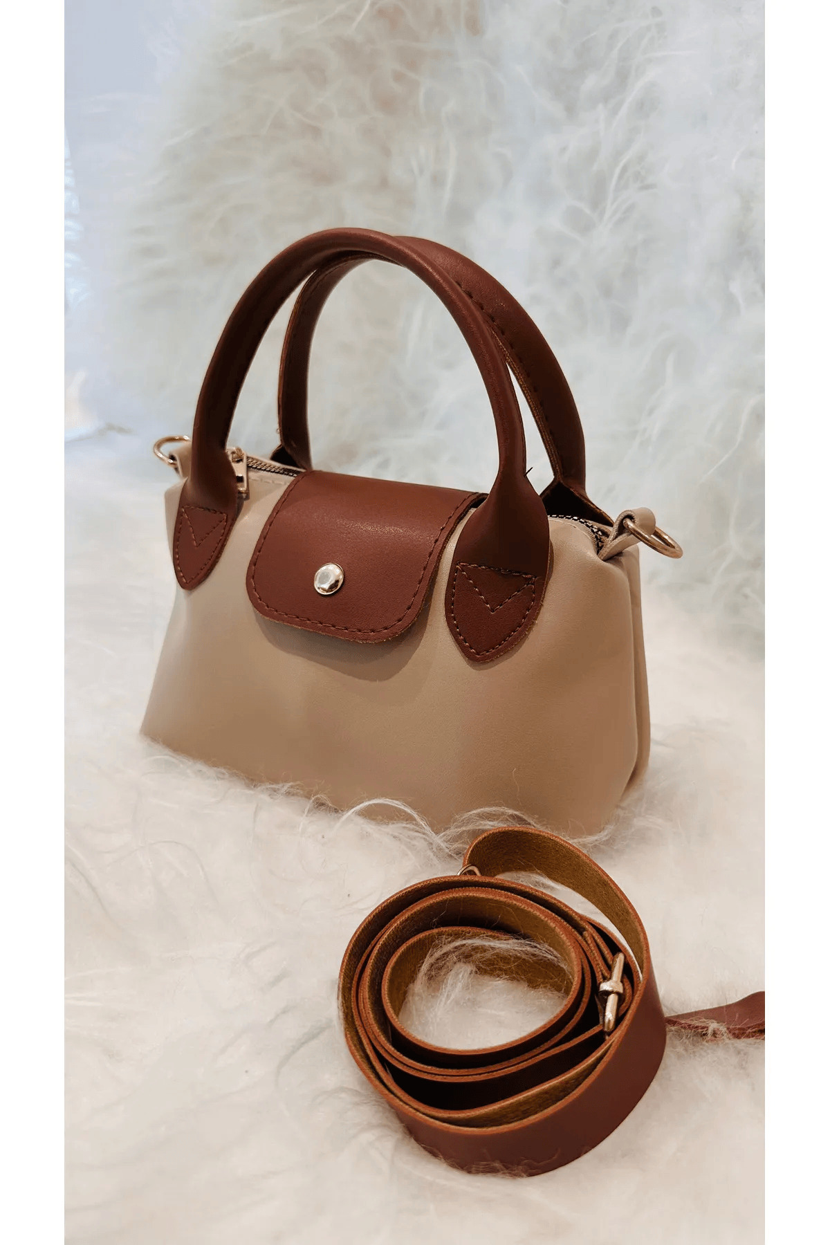 - Günlük kullanım için ideal,krem ile kahvenin mükemmel buluşması casual tarza sahip krem renkli suni deri saplı küçük boy el ve omuz çantası.