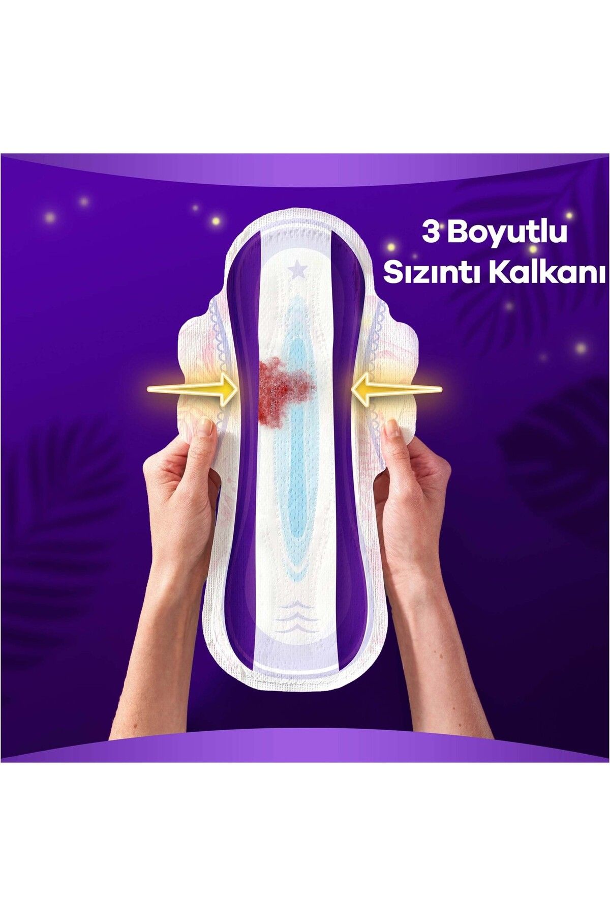 - Gece boyunca maksimum konfor ve koruma sağlayan gece pedi, uyku sırasında vücut tarafından emilen nemin azaltılmasına yardımcı olur
