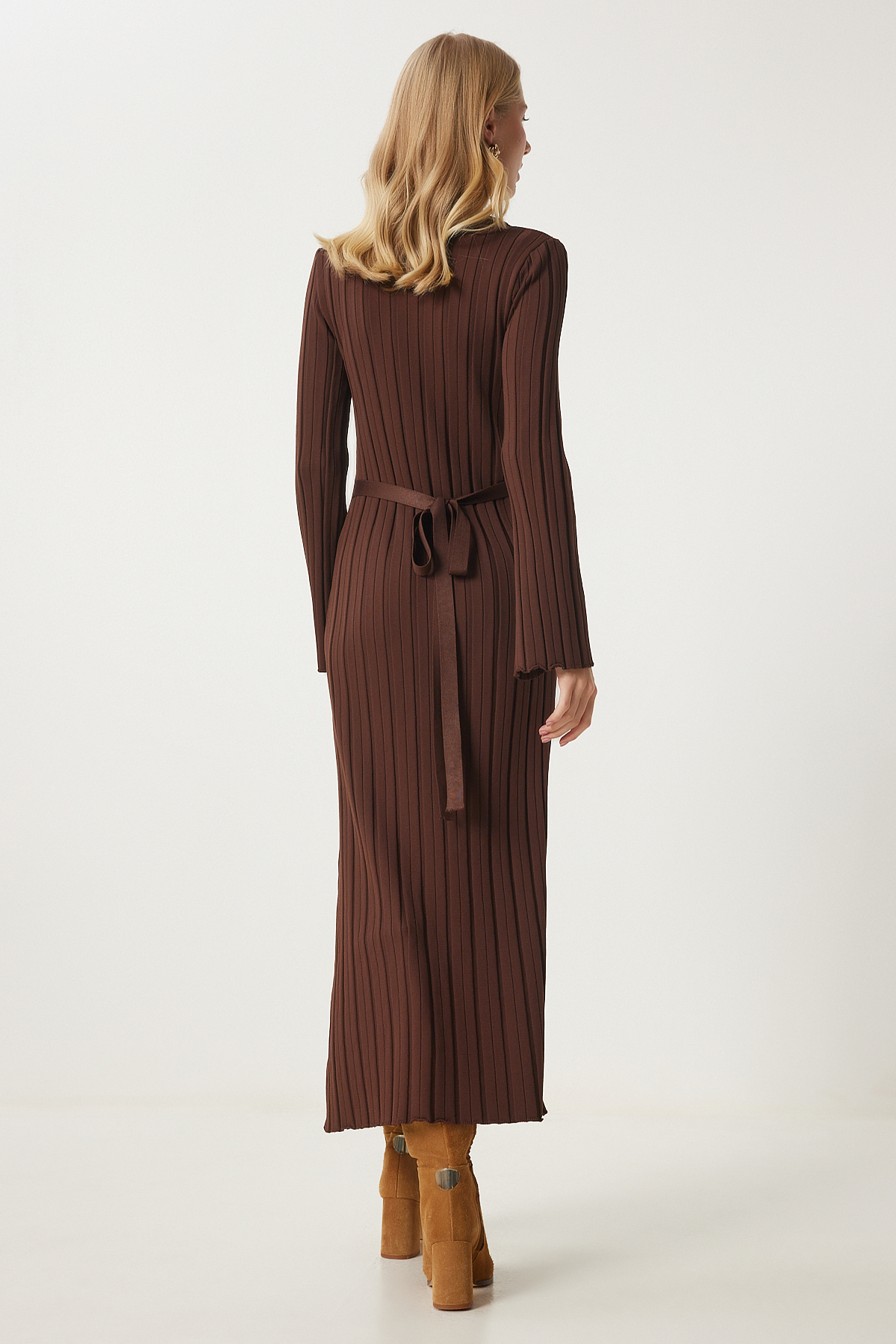 Bisiklet yaka, uzun kollu, fitilli, esnek yapılı, uzun triko elbise
