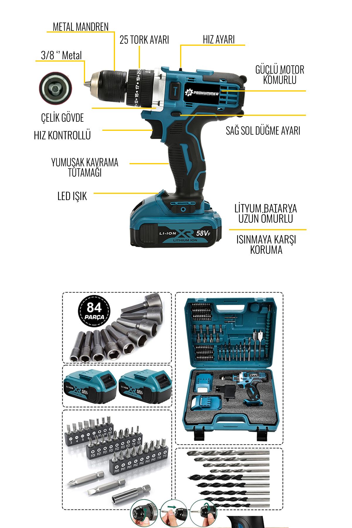 PH229 Yeni Seri 58vf Şarjlı Matkap Mavi Çift Akülü Darbesiz 84 Parça Set Hediyeli