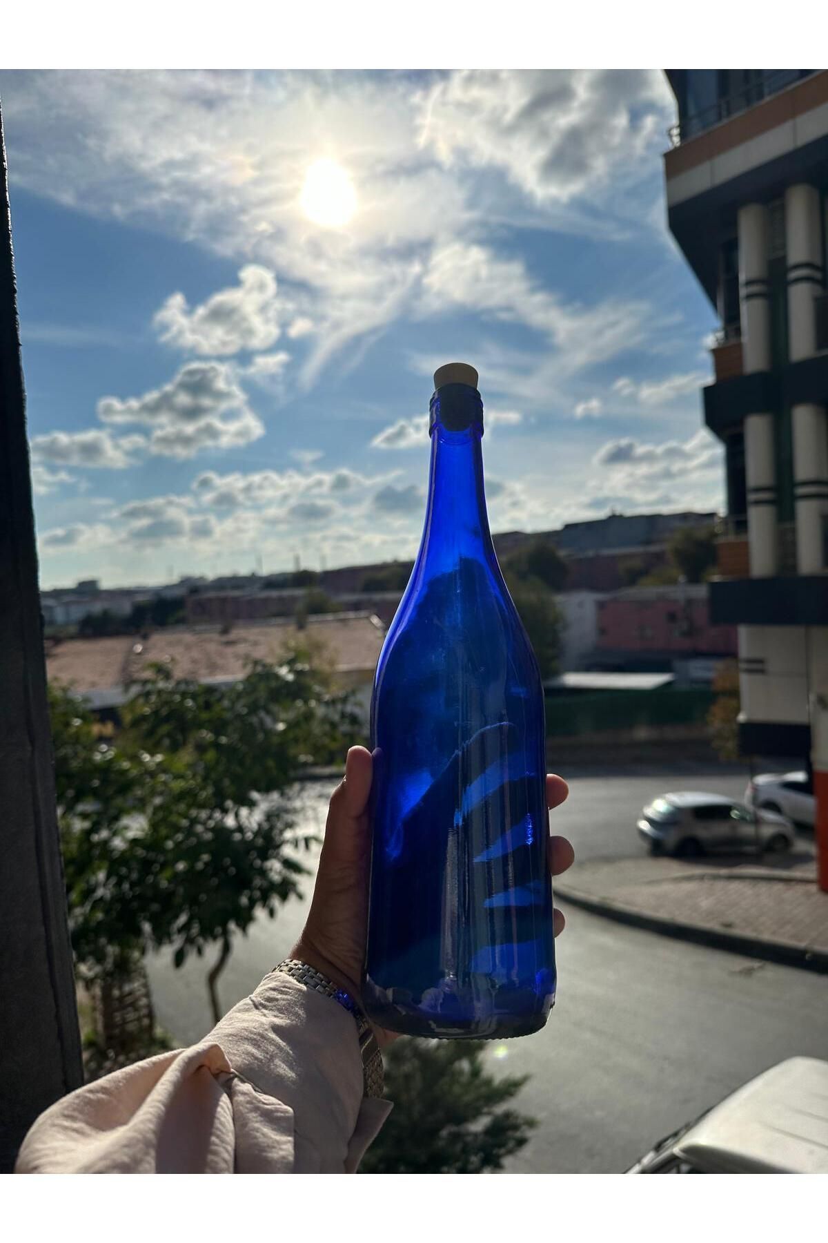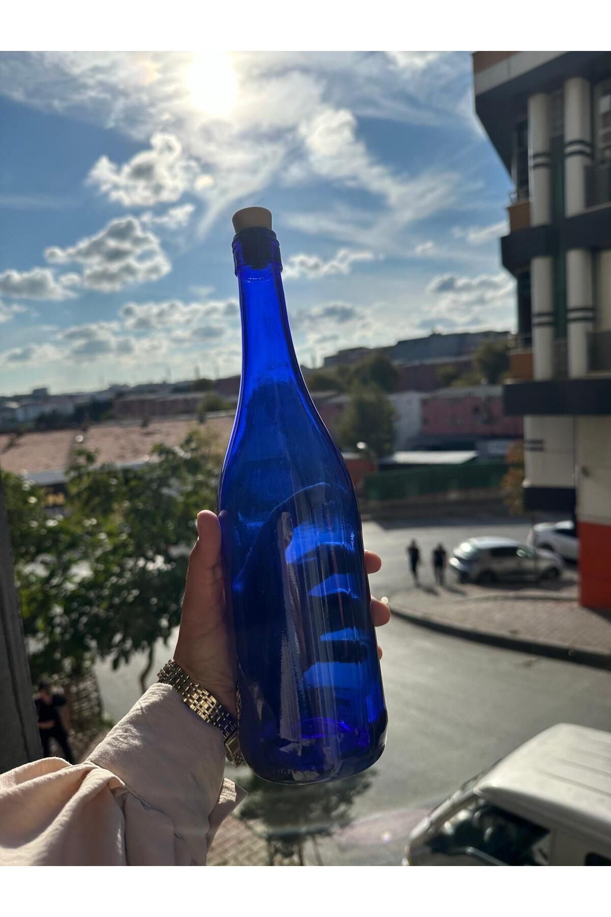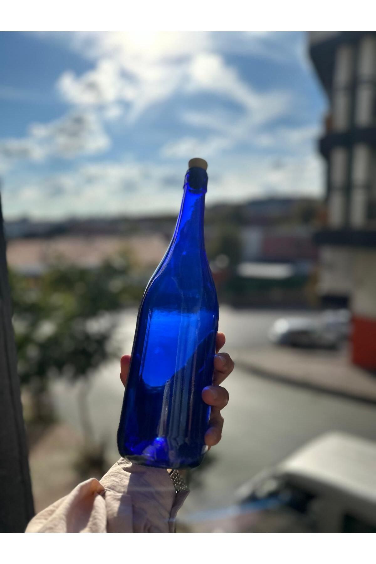 Şık ve modern tasarımıyla dikkat çeken mavi cam mantar kapak sürahi, 750 ml kapasitesiyle günlük kullanım için idealdir