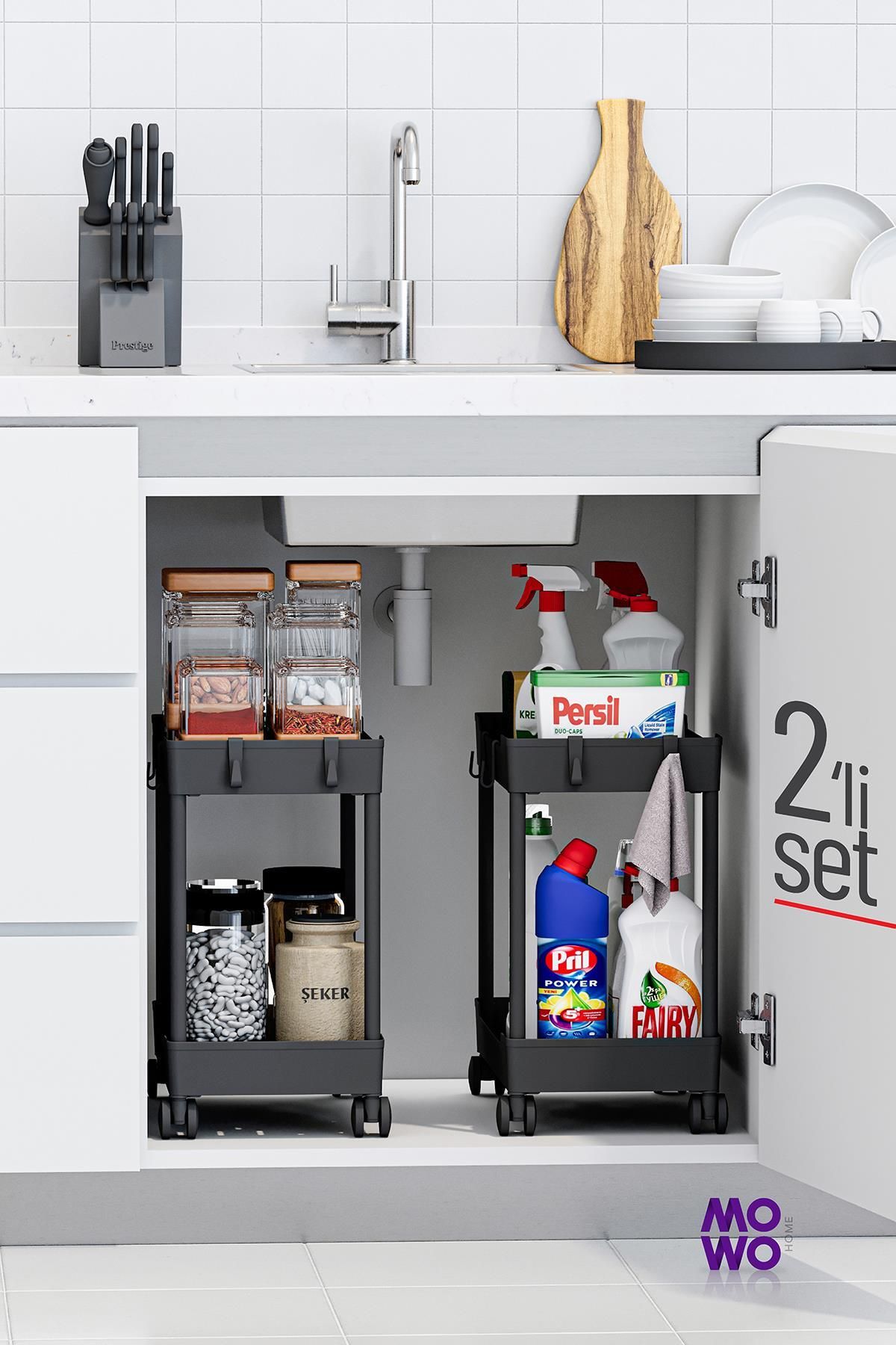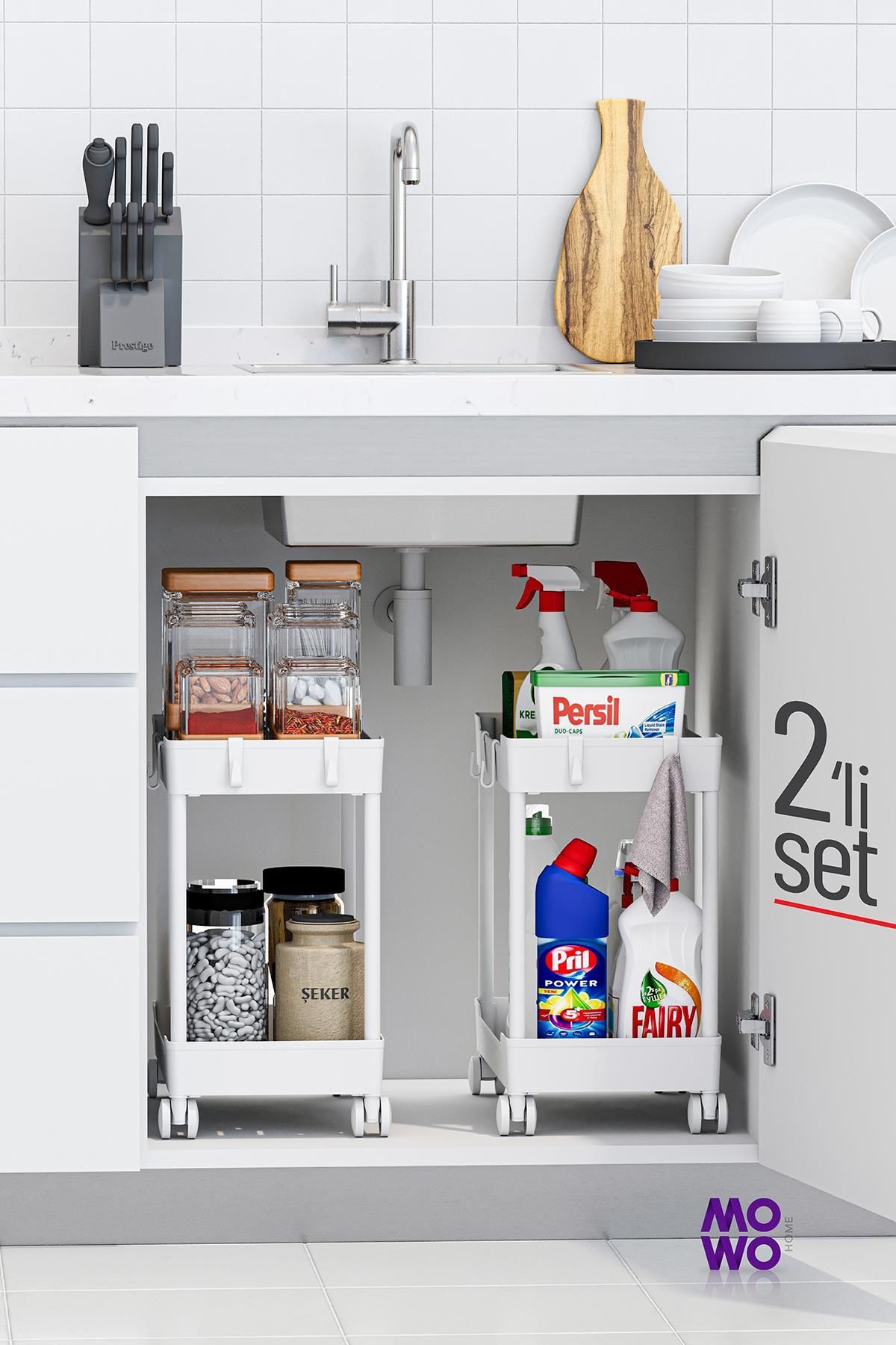 2'li set (2 adet 2 katlı Raf ) Mowo 2 Katlı Tekerlekli Tezgah Altı Düzenleyici raf sistemi.