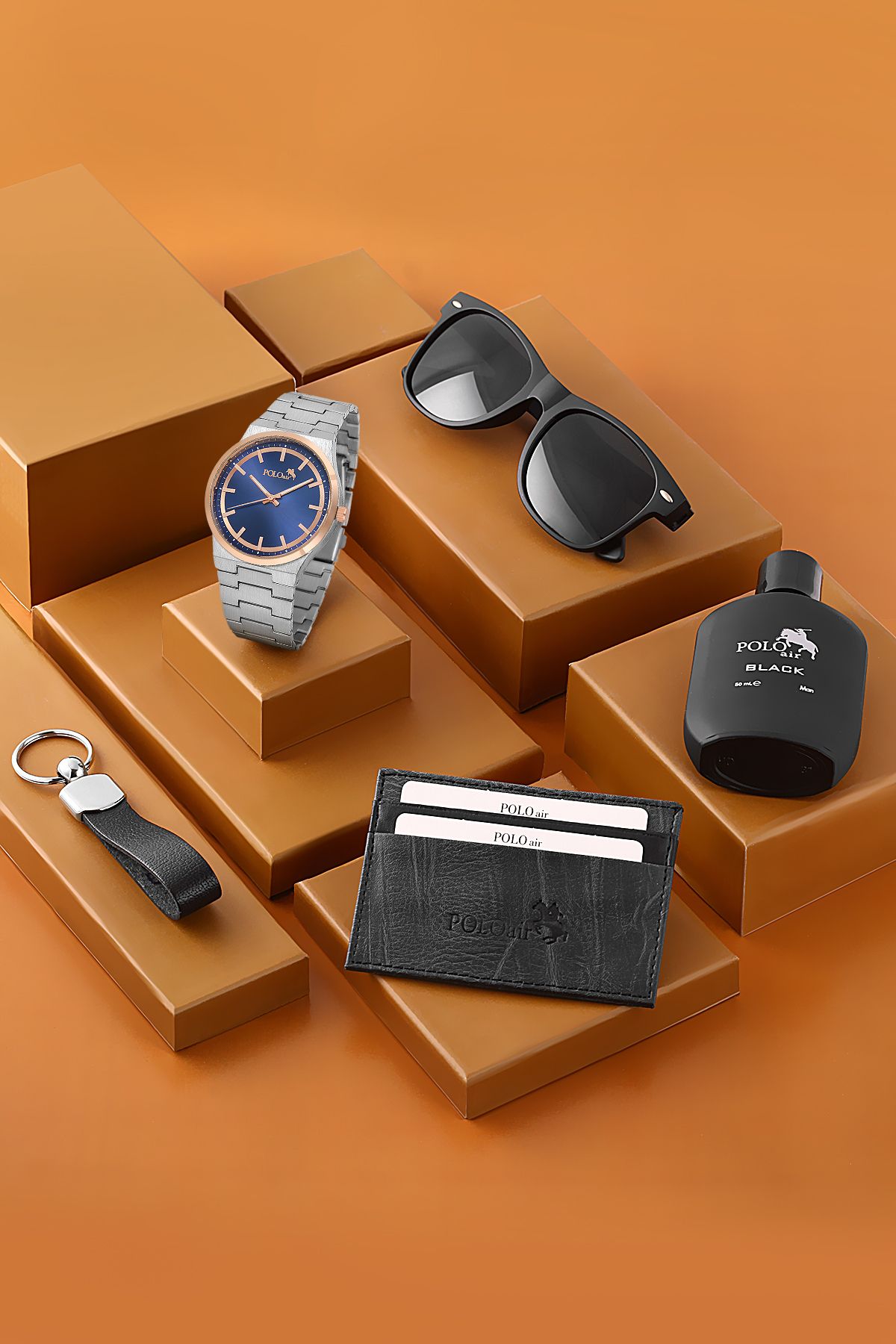 Erkek Kol Saati Gözlük Parfüm Kartlık Anahtarlık Kombin Set Gümüş Bakır Lacivert Renk Pl-0917e2