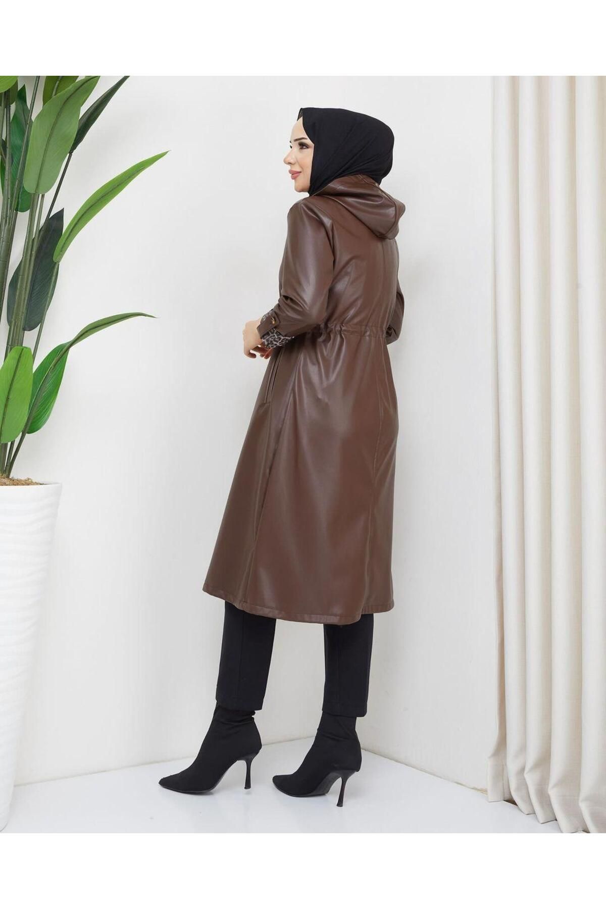 - Kahverengi tonlarındaki deri kapüşonlu trençkot, şıklığı ve rahatlığı bir arada sunar.