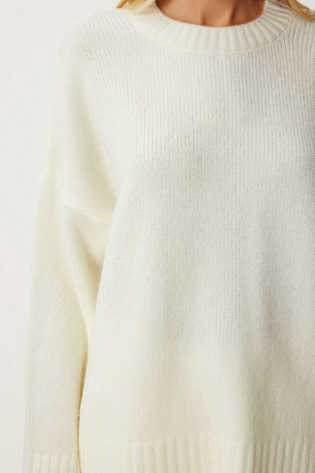 Bisiklet yaka, düşük omuzlu, esnek yapılı, yumuşak dokulu, oversize triko kazak İçerik: %74 Akrilik %19 Polyester %7 Elastan Ürün boyu: 66 cm Kol boyu: 67 cm 30° makinede yıkanabilir.