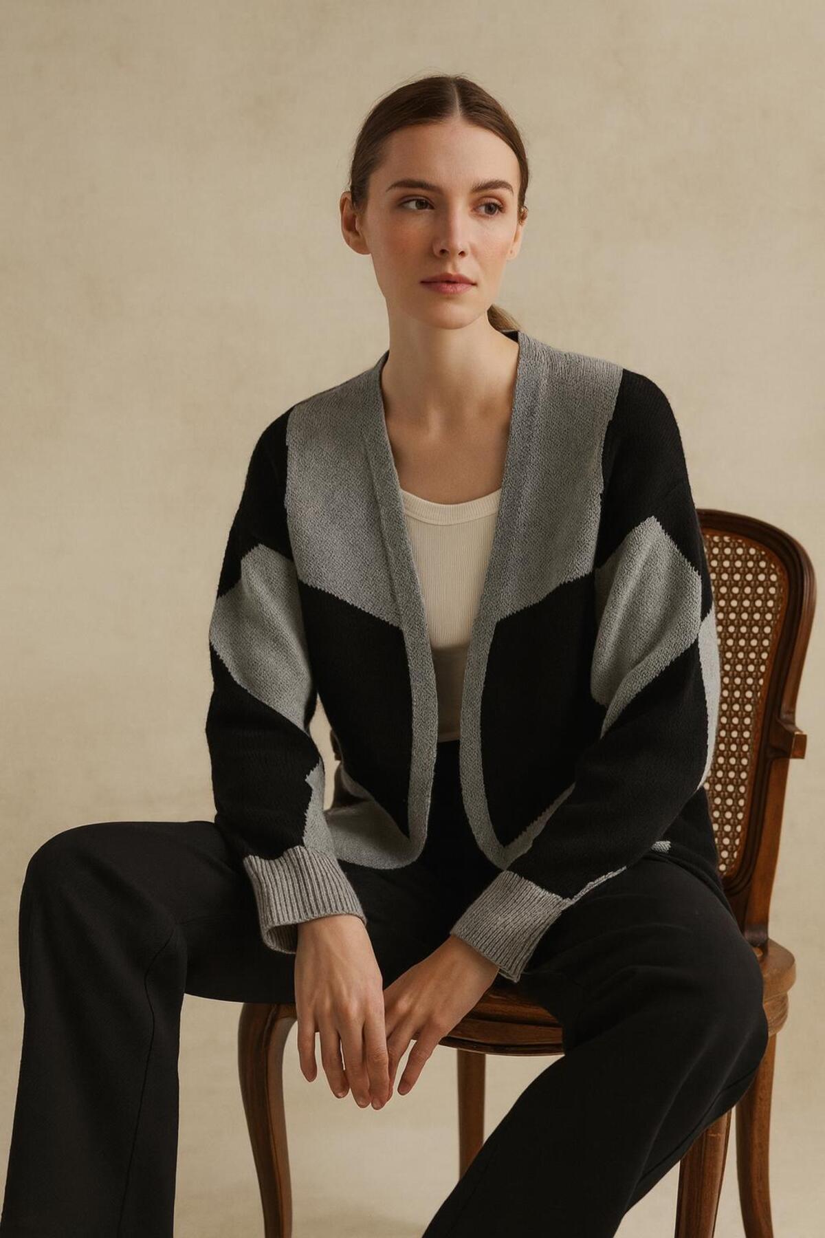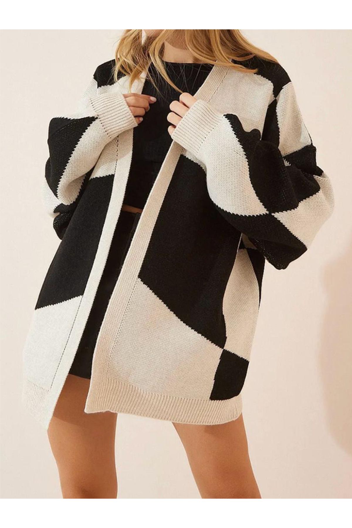 - Kontrast desenli tasarımıyla dikkat çeken bu hırka-ceket, günlük şıklığınızı tamamlar.