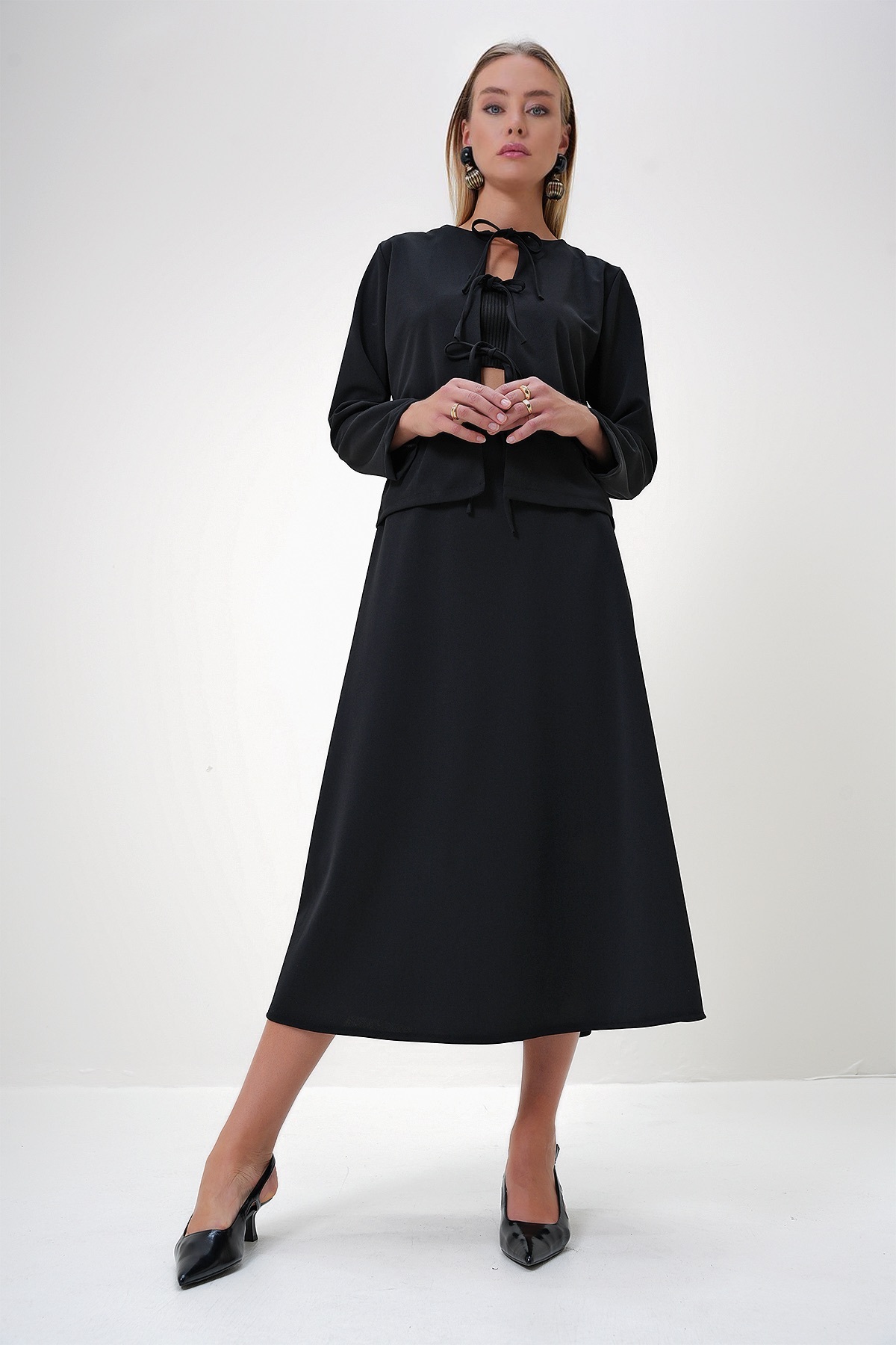 Zarif Ve Modern Bir Görünüm İçin Tasarlanmış Bu Bisiklet Yaka Ceket Ve Maxi Boy Etek Takımı, Stilinizi Öne Çıkaracak Mükemmel Bir Seçenek. Ceket, Önü Bağlama Detayıyla Hem Şık Hem De Pratik Bir Kullanım Sunarken, Krep Örme Kumaşıyla Hafif Ve Rahat Bir His Verir. Maxi Boy Etek, Akıcı Kesimiyle Zarif Bir Siluet Oluşturur. Ofis Şıklığından Özel Etkinliklere Kadar Her Ortamda Rahatlıkla Giyilebilir.