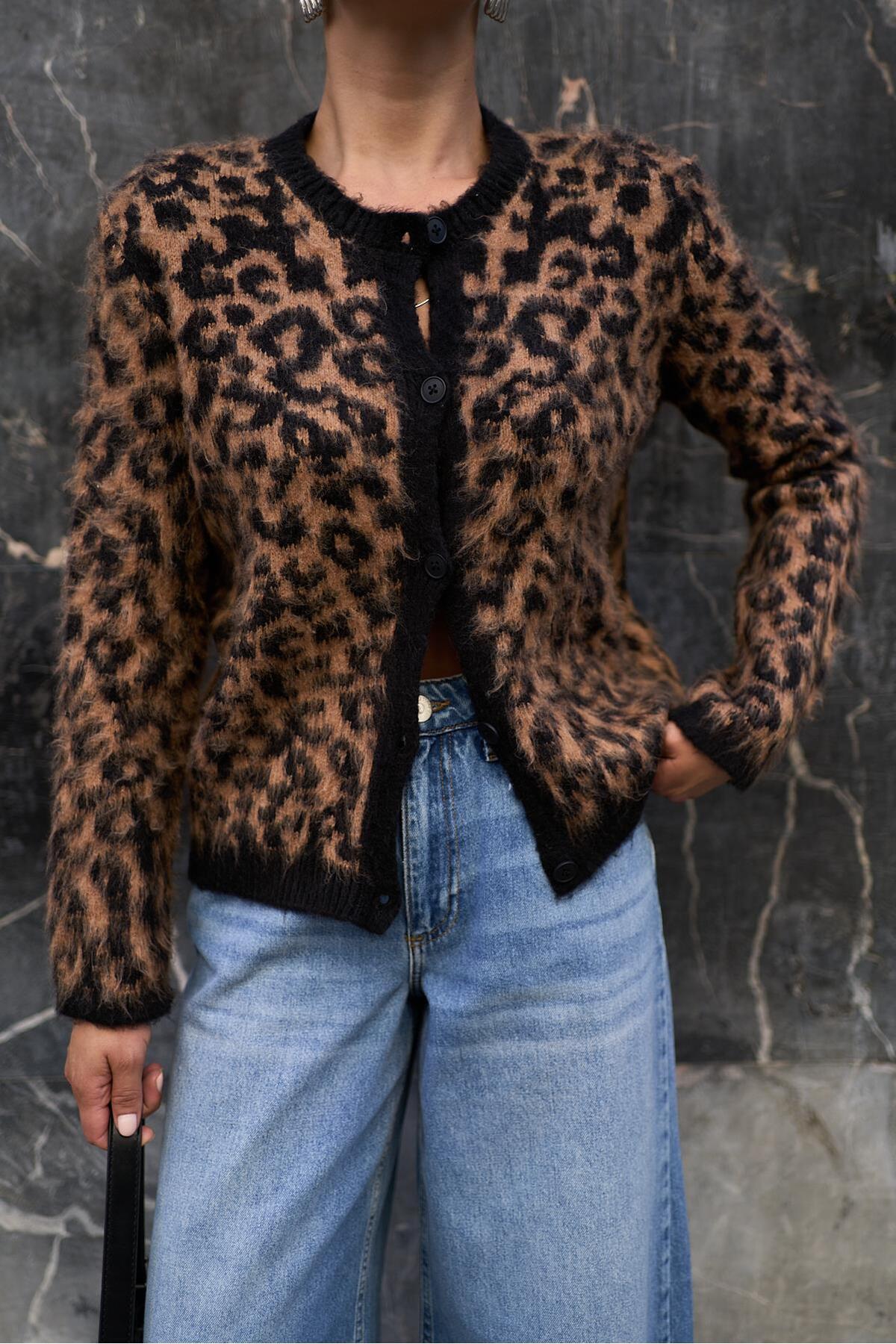 - Bej ve siyah renklerin uyumlu birleşimiyle, her ortamda şıklığınızı tamamlayacak leopar desenli hırka.