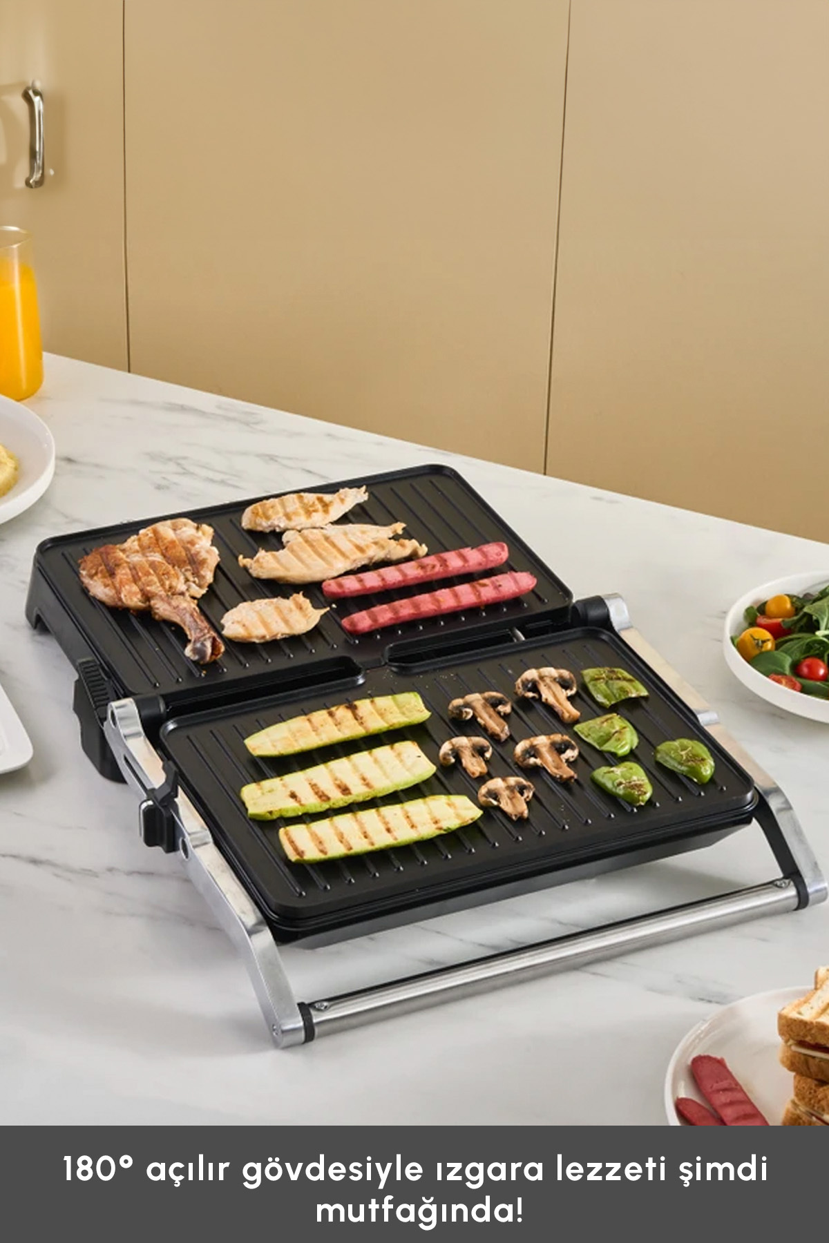 -6 dilim ekmek kapasitesi ve 180 derece açılabilir gövdesi ile ızgaralarınızı istediğiniz şekilde pişirebilir, aile boyu kullanım sağlayabilirsiniz.