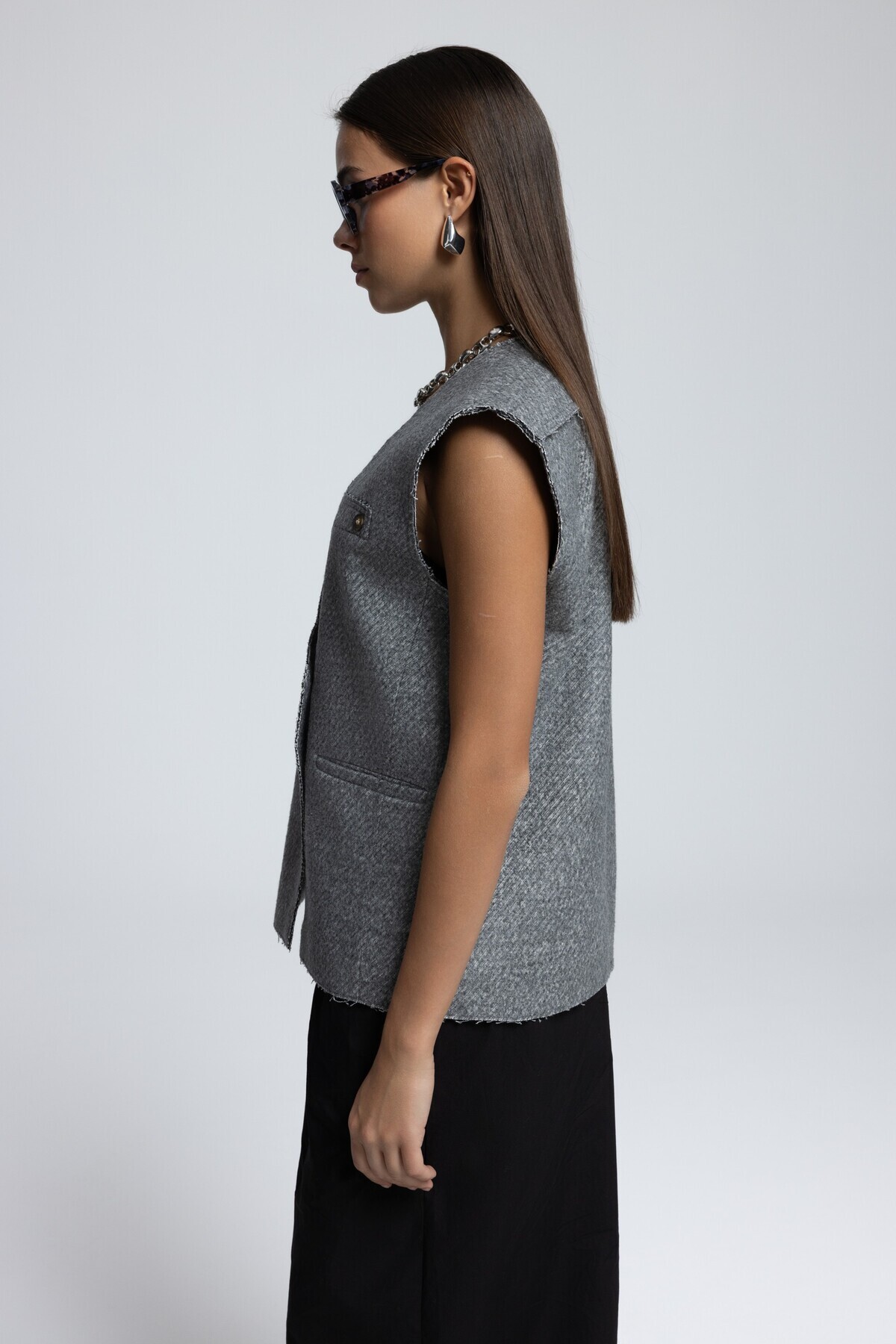 Faven Gri Yan Yırtmaç Detay Yelek