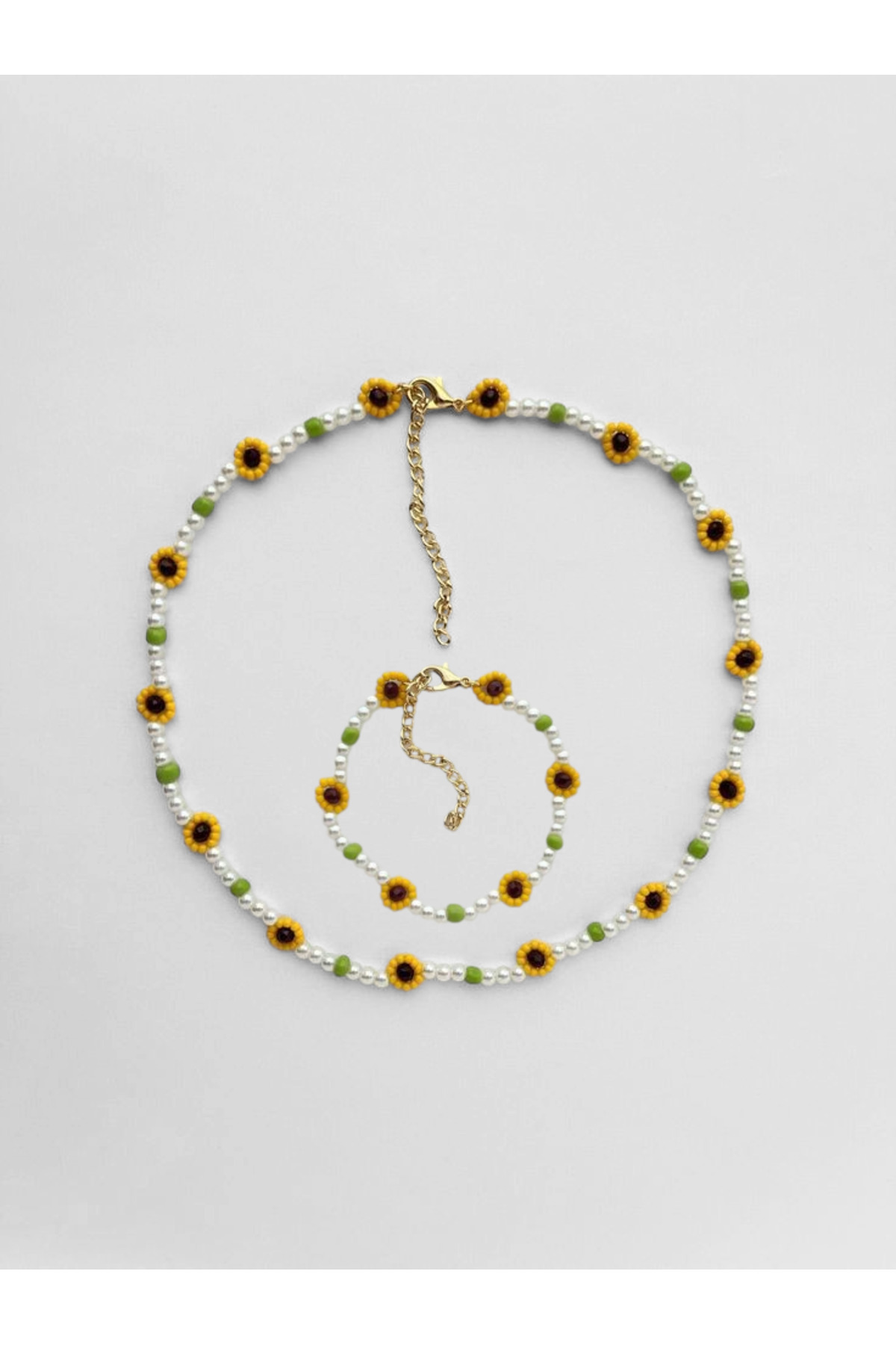Zarif tasarımıyla dikkat çeken ayçiçeği kolye ve bileklik seti, boncuk materyali sayesinde ışıltınızı her ortamda ön plana çıkarır
