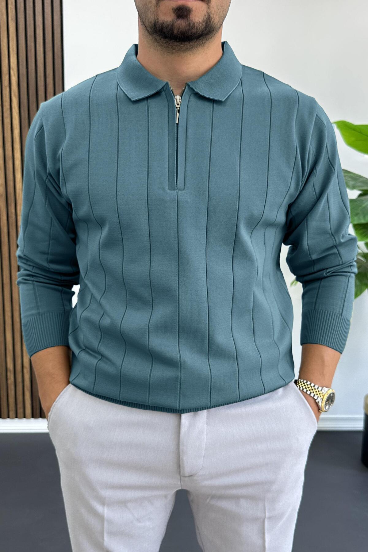 Erkek Yarım Fermuarlı Polo Yaka Mevsimlik Kazak Lacivert Edw195