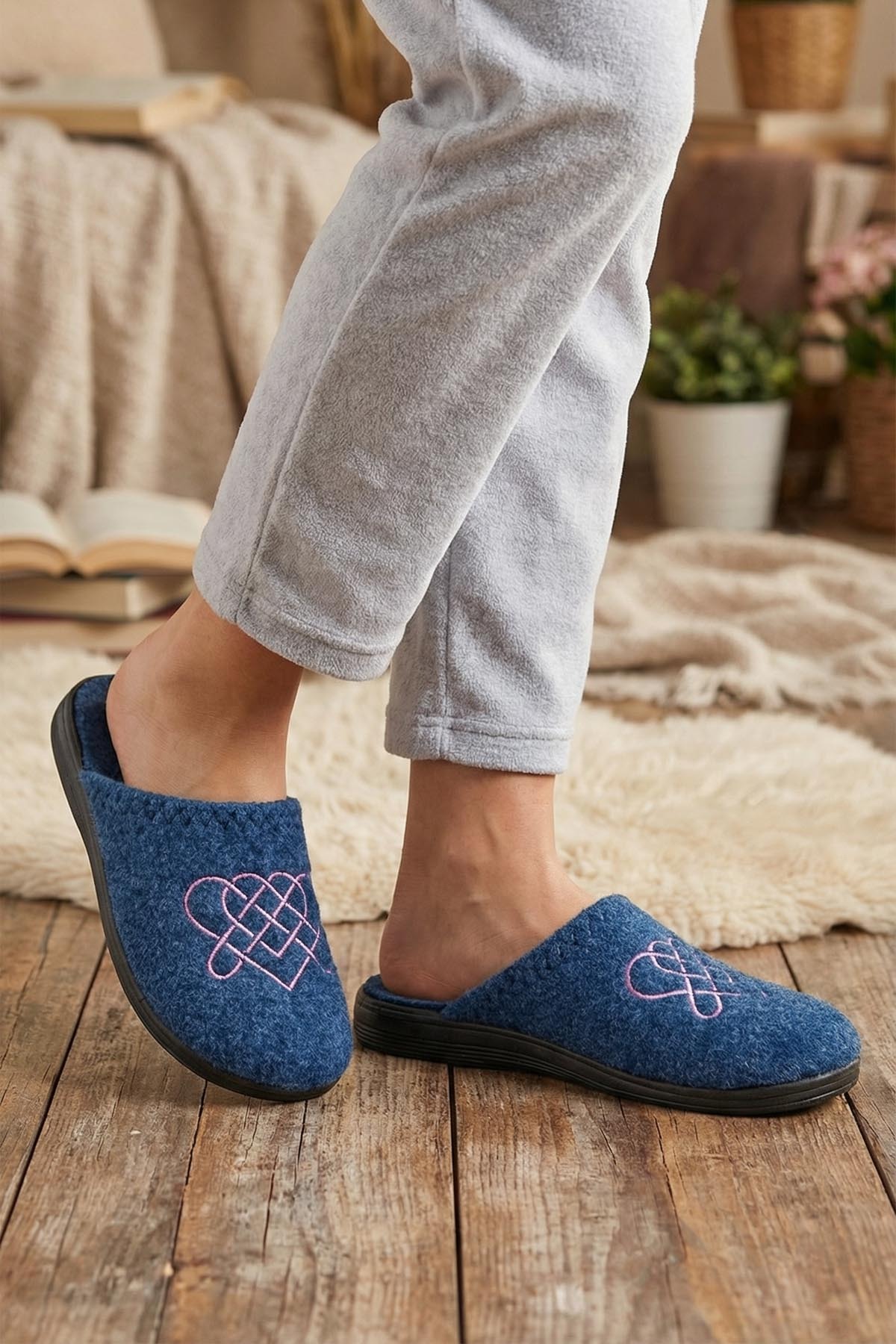 Kadın Kışlık Keçe Nakışlı Kalp Tasarım Ev Bahçe Terlik