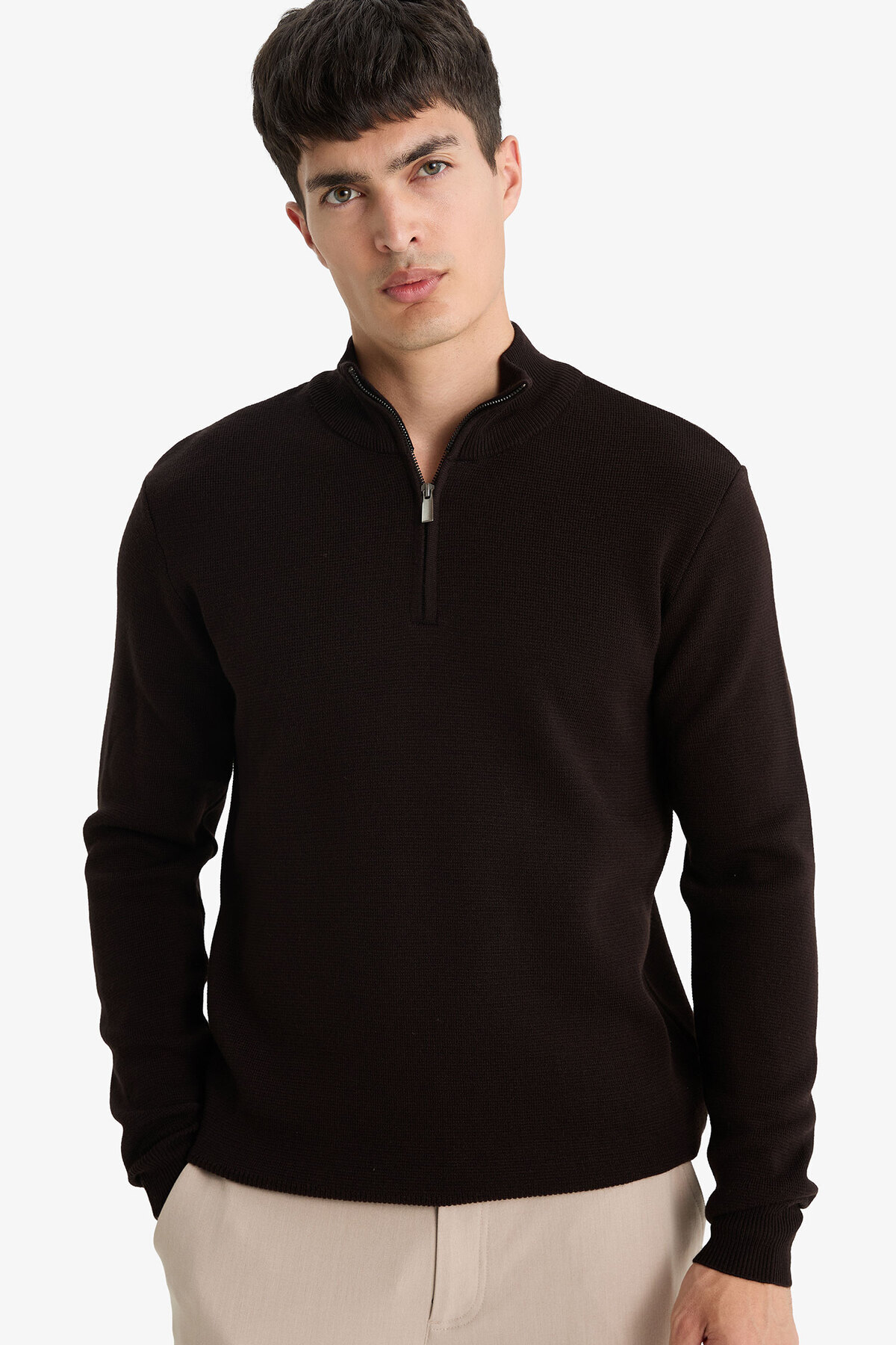 Şıklığı ve konforu bir arada sunan Standart Fit Yarım Fermuarlı Kazak, gardırobunuzun vazgeçilmezi olmaya aday.