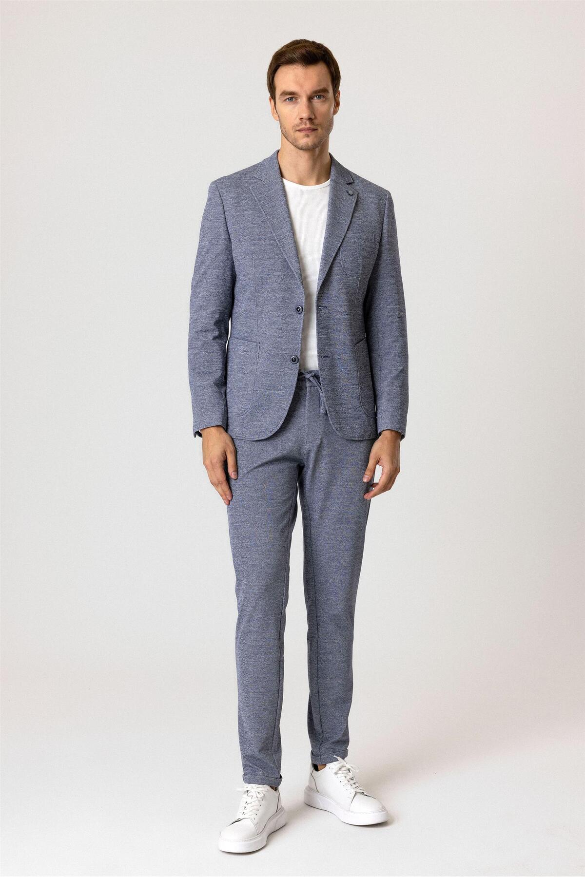 Parlament Mavi Slim Fit Desenli Mono Yaka 6 Drop Spor Takım Elbise