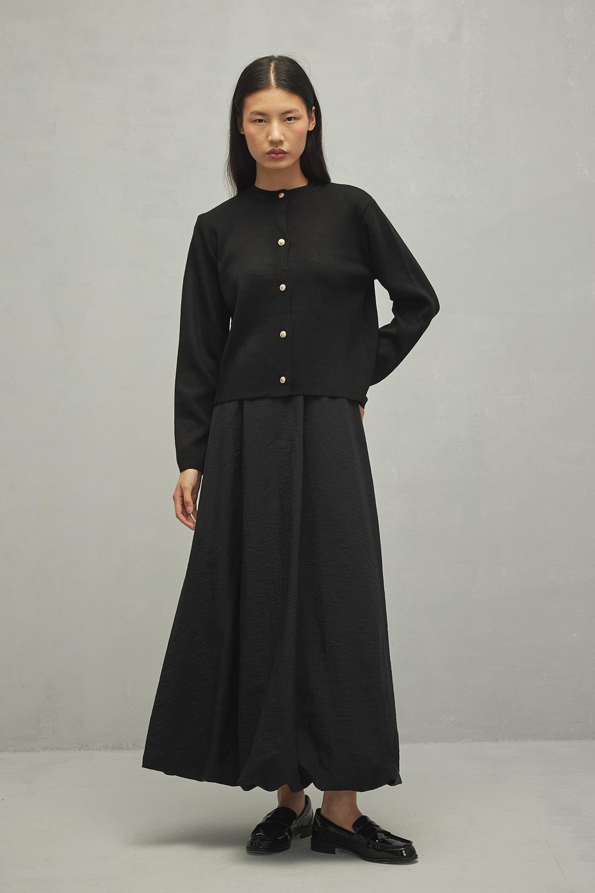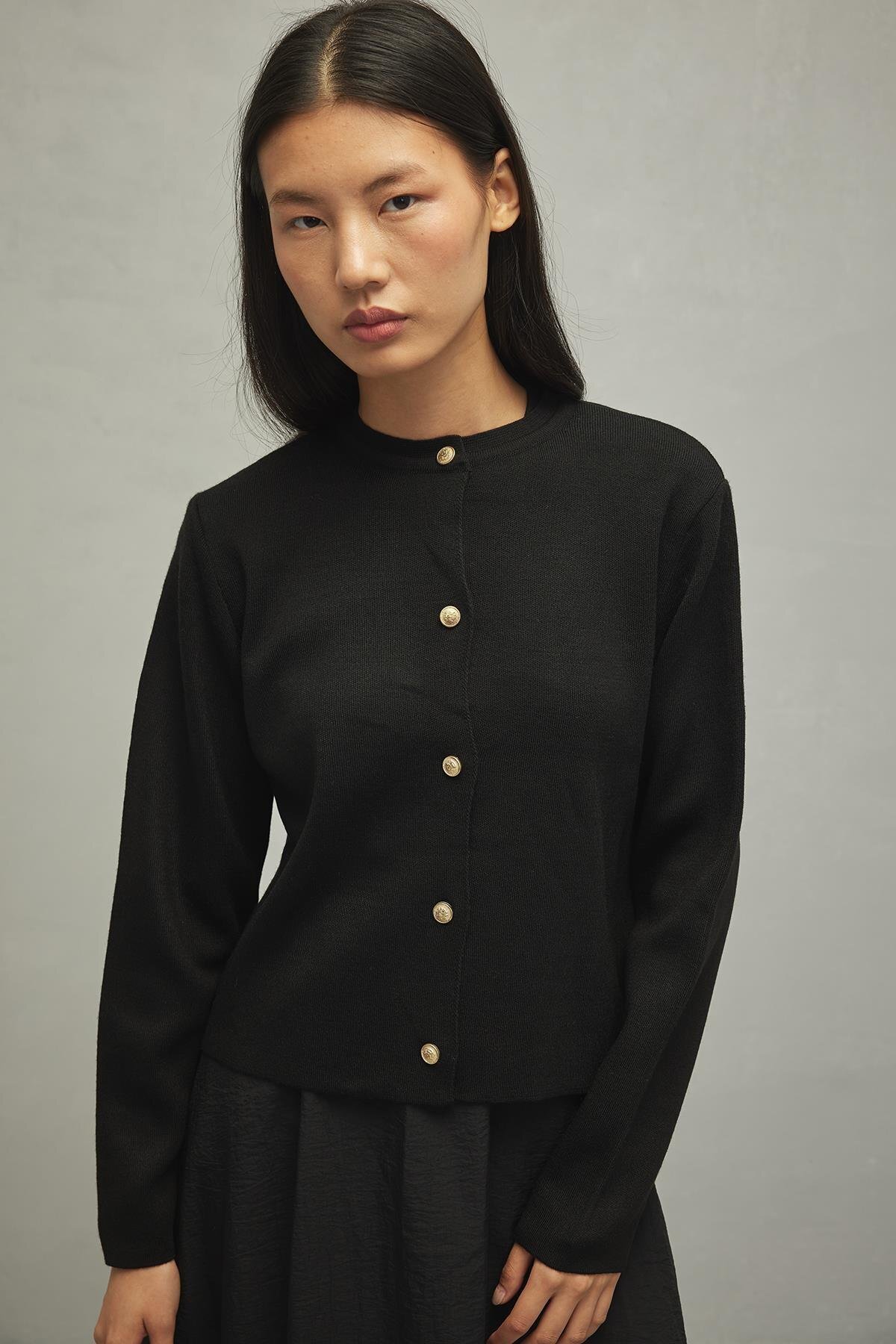 Sık örgü triko, bisiklet yaka, gold binici düğmeli crop hırka.