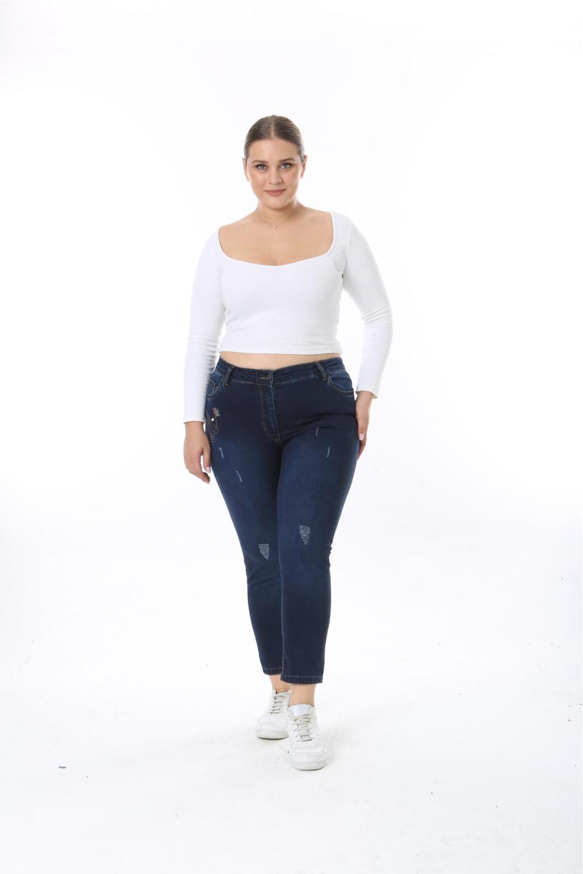 KADIN BÜYÜK BEDEN KOT PANTOLON ESNEK KUMAŞ CEP NAKIŞLI