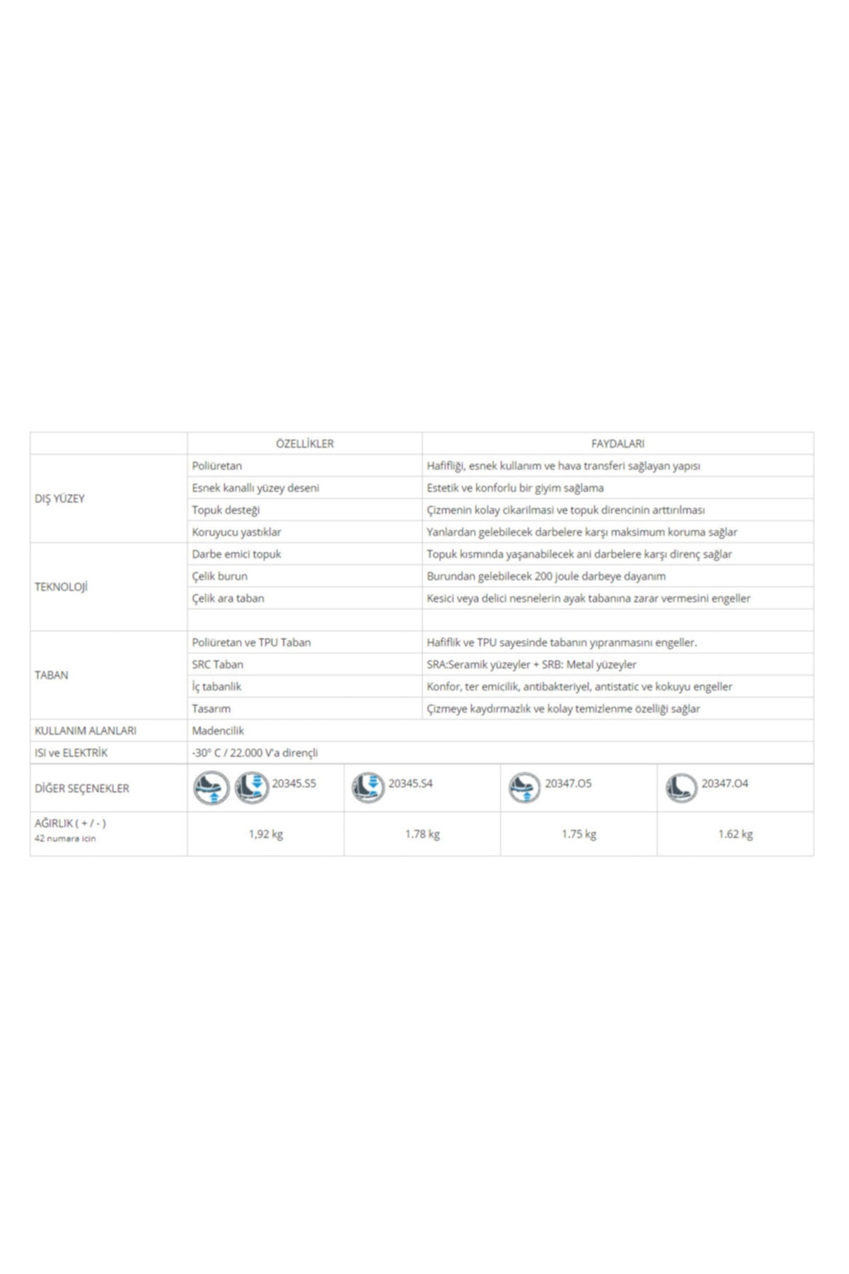 (Çelik burun ve çelik arataban bu modelde yoktur.) Özellikleri ve Faydaları Dış Yüzey Poliüretan - Hafifliği, Esnek Kullanım Ve Hava Transferi Sağlayan Yapısı Topuk Desteği - Çizmenin Kolay Çıkarılması Ve Topuk Direncinin Arttırılması Koruyucu Yastıklar - Yanlardan Gelebilecek Darbelere Karşı Maksimum Koruma Sağlar Teknoloji Darbe Emici Topuk - Topuk Kısmında Yaşanabilecek Ani Darbelere Karşı Direnç Sağlar Taban Poliüretan ve Tpu Taban - Hafiflik Ve Tpu Sayesinde Tabanın Yıpranmasını Engeller.